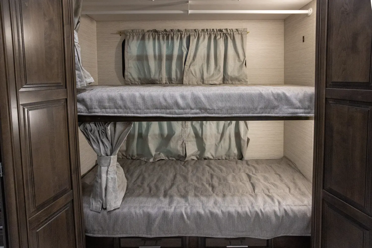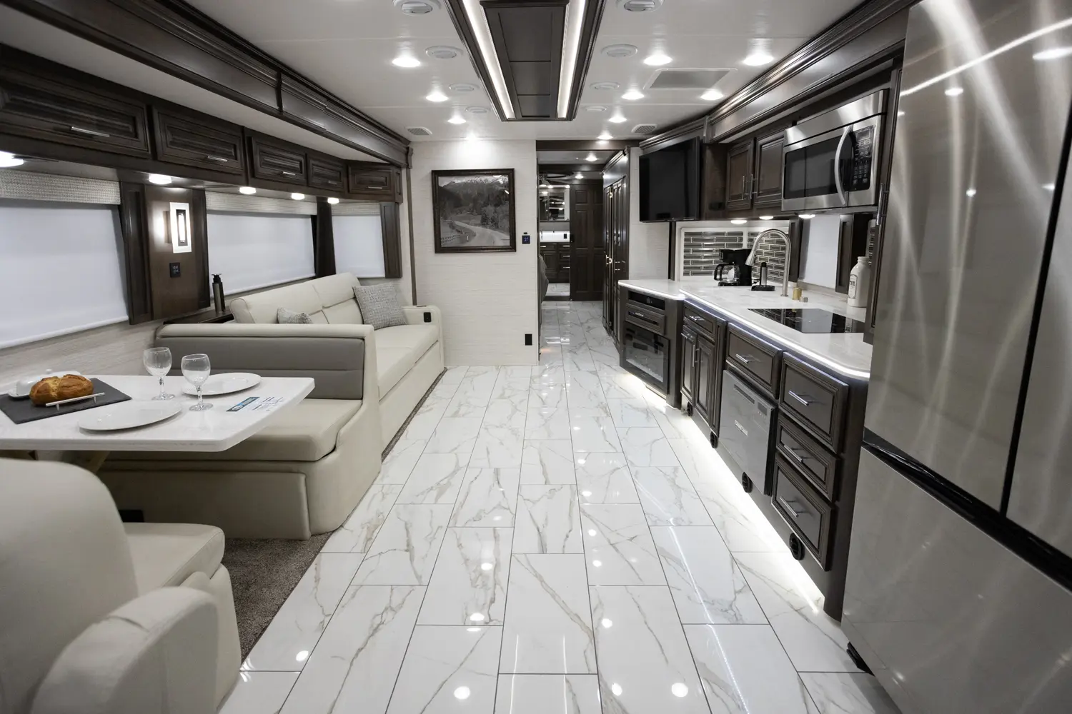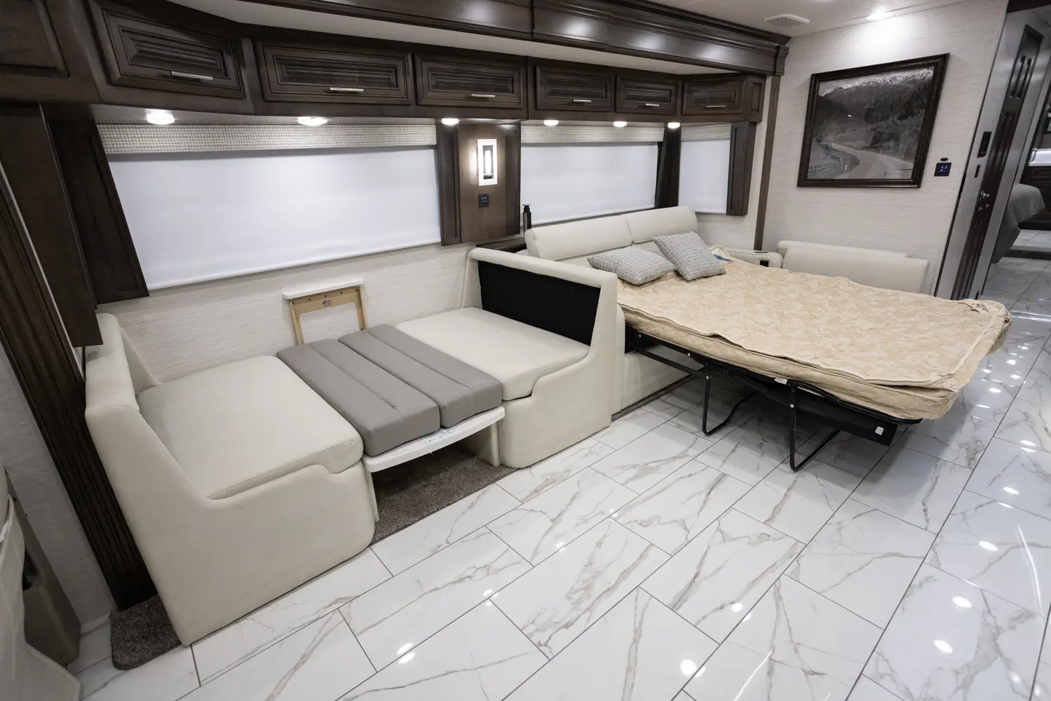 The Berkshire XLT 45A is a four-slide bunkhouse model with two full bathrooms. The rear large full bath includes a shower, vanity with dual sinks, overhead cabinets, and stacking washer/dryer. The main bedroom has a slideout, 72" x 80" Tilt-a-View king bed, plus a dresser, wardrobe cabinet, 43" TV, and overhead cupboards. The second full bath has a shower, vanity sink, medicine cabinet, and commode. Across across from this bathroom is the bunk room/wardrobe combo. The kitchen provides a convection microwave, induction cooktop, and residential-style refrigerator. Just over the cockpit, you'll find a unique drop-down bed that provides an additional sleeping surface at night.