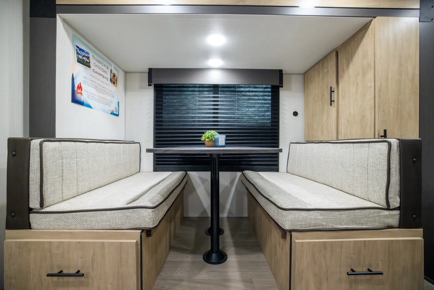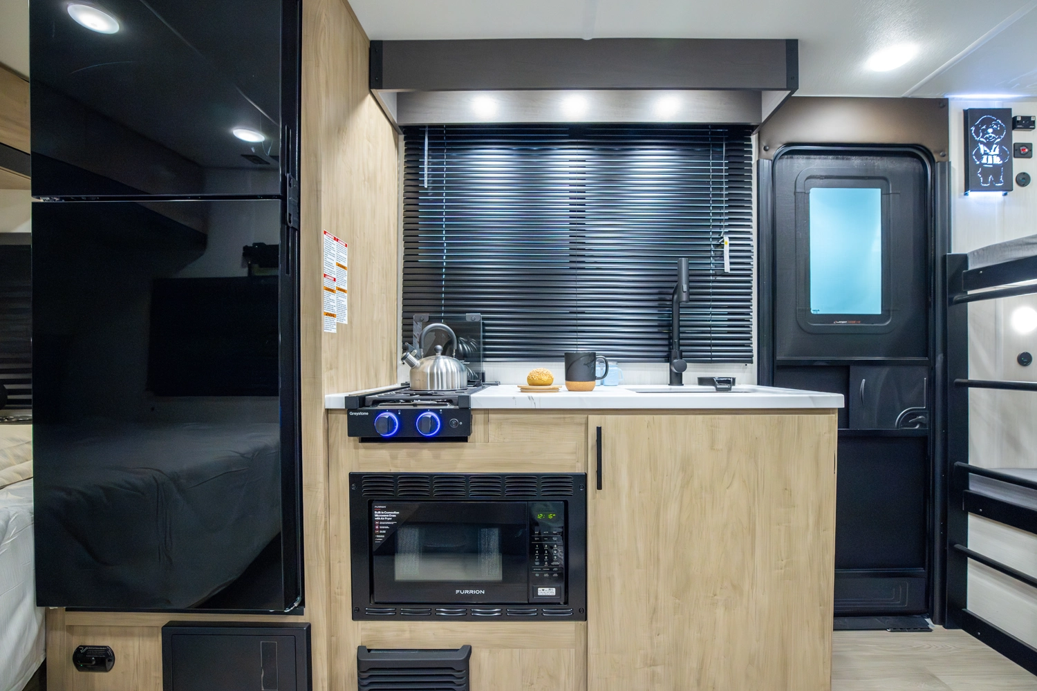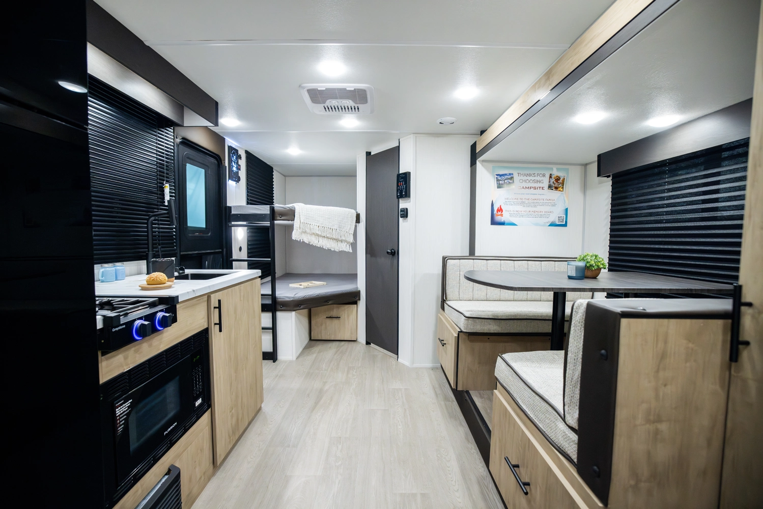 Check out one of the most lightweight, compact, and capable bunkhouse travel trailers. The 17LS can fit many people in a small amount of space and still feel comfortable and spacious. How, you ask? A queen bed with overhead cabinets makes life simple and easy for those in the primary sleeping area. In the rear bunk spot, you’ve got double-over-double bunk beds with a combined weight rating of 1.200 pounds. The bunks also feature underneath storage.