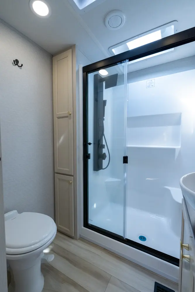 • Full 48” x 30” Rectangular Shower with Seat and Sliding Glass Doors