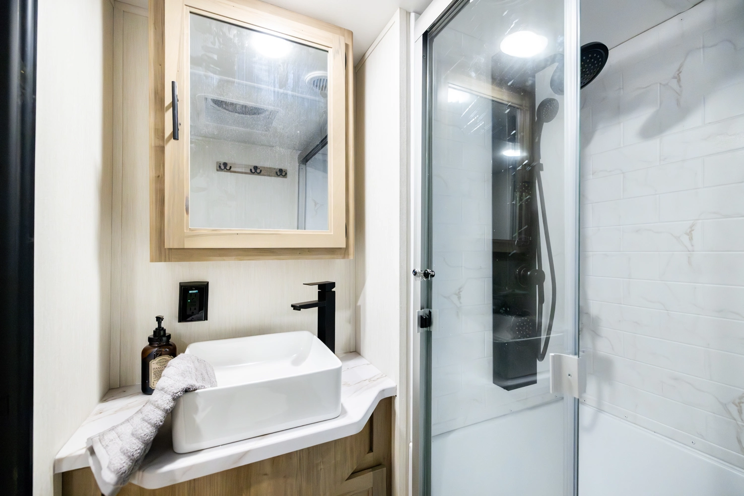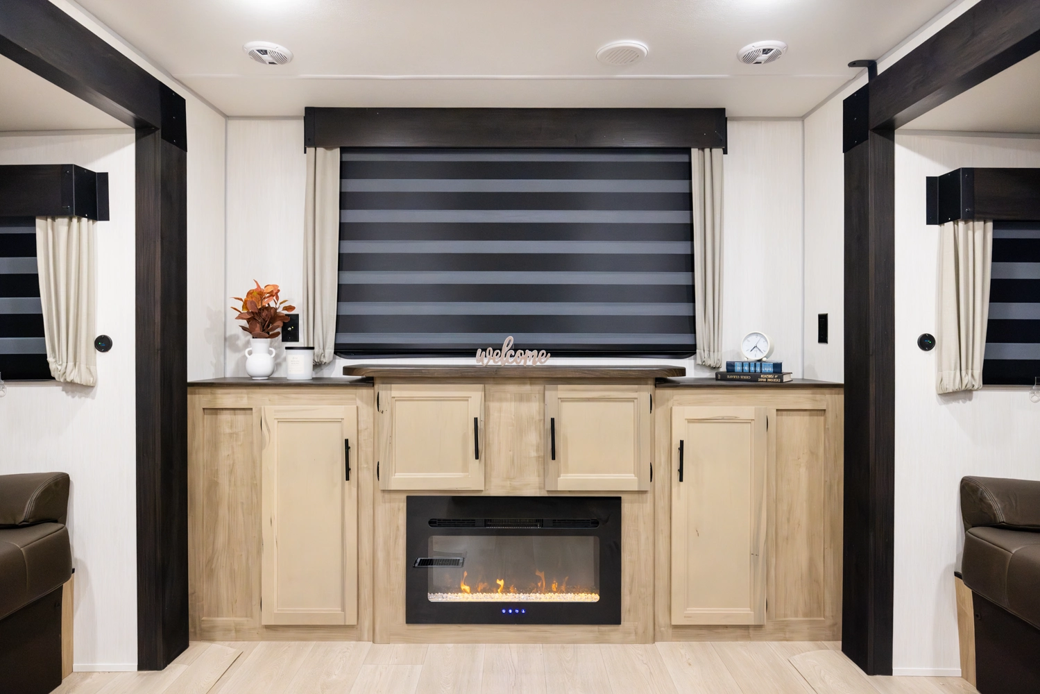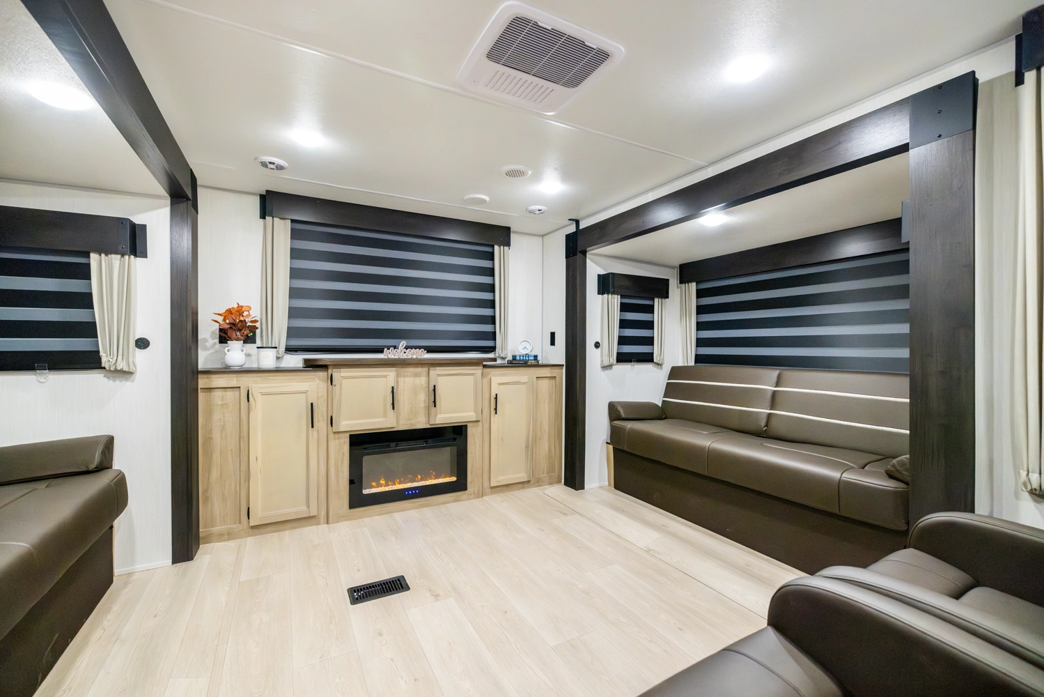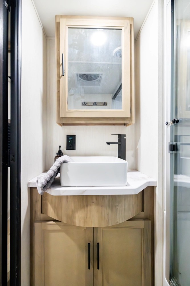 The triple slide is the perfect unit for affordable luxury and livability. The rear entertainment living room is surrounded by panoramic windows as well as two sofa slide and two recliners. The chef’s kitchen, kitchen bar with stools, and dinette slide with slide out drawers and full door pantry offer meet the needs of any chef. The private master suite completes the interior. Outside enjoy the Cherokee camp kitchen, outside entertainment speakers, and TV bracket under our power awning.