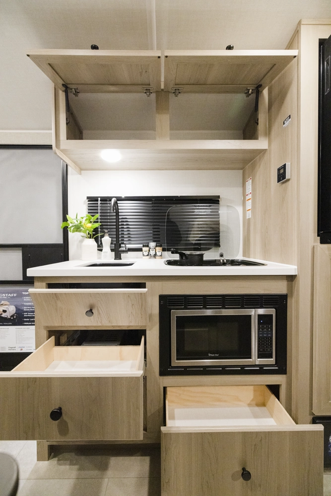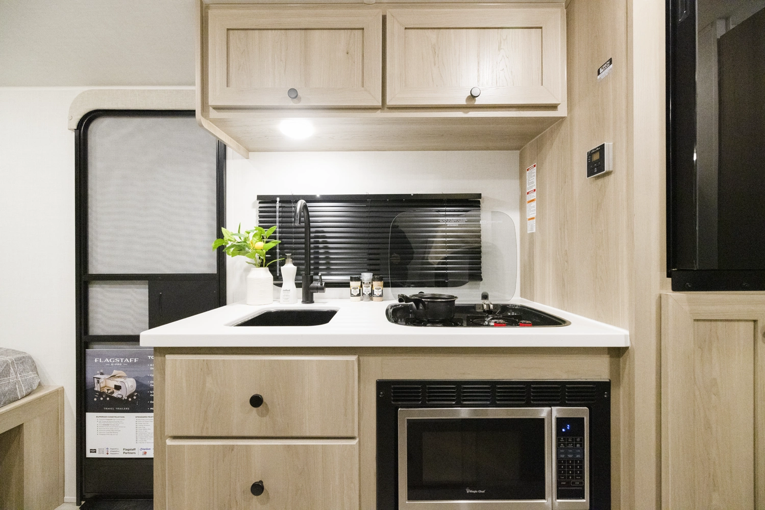 The 17LE is a lightweight, affordable bunkhouse camper built without sacrificing the quality Flagstaff is known for. Its compact design makes towing easy while features like durable 6 side aluminum framing and vacuum bonded walls and roof ensure long lasting performance. Perfect for first time buyers or budget conscious adventurers the 17LE Delivers reliable, high-quality camping in a nimble, easy-to-handle package.