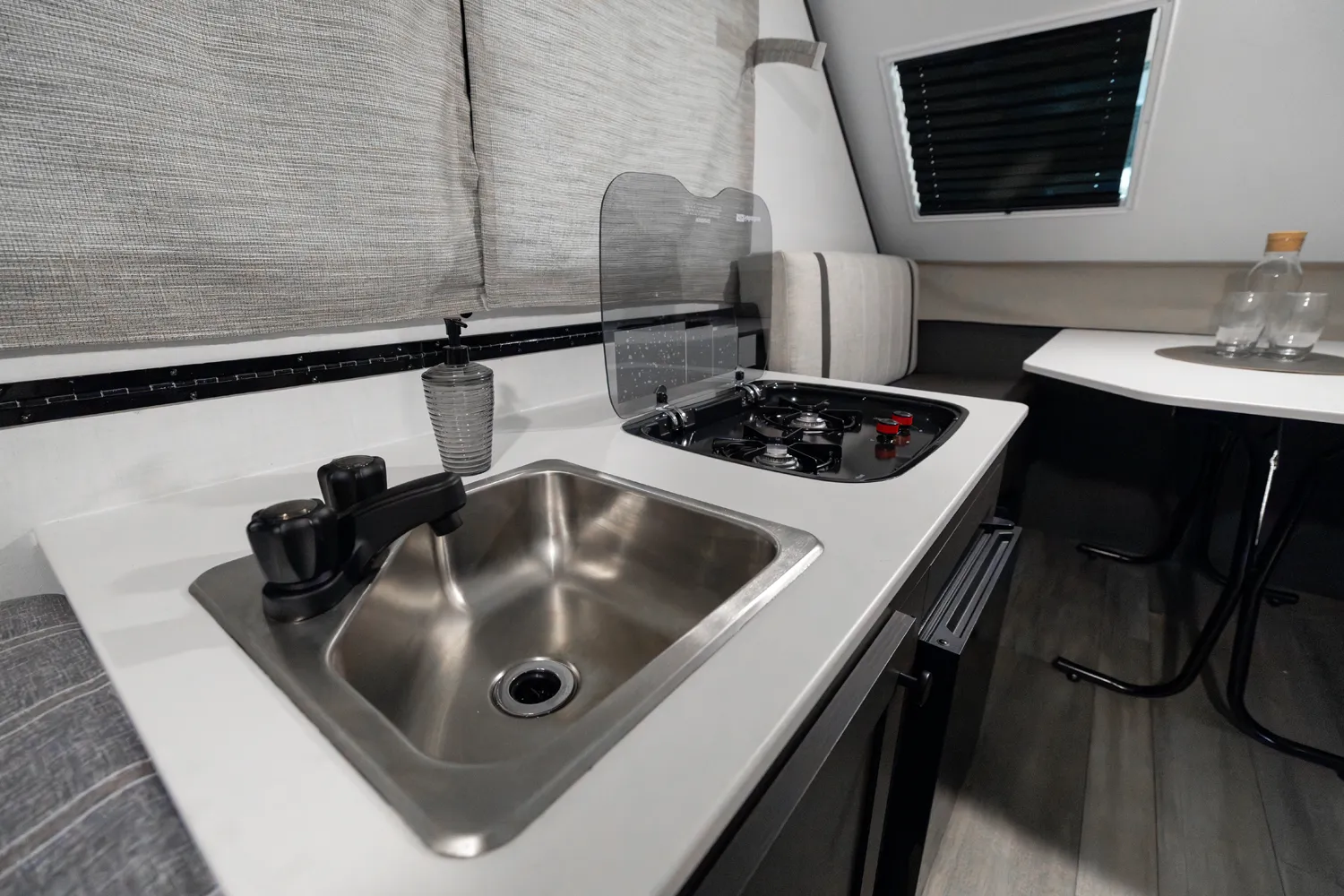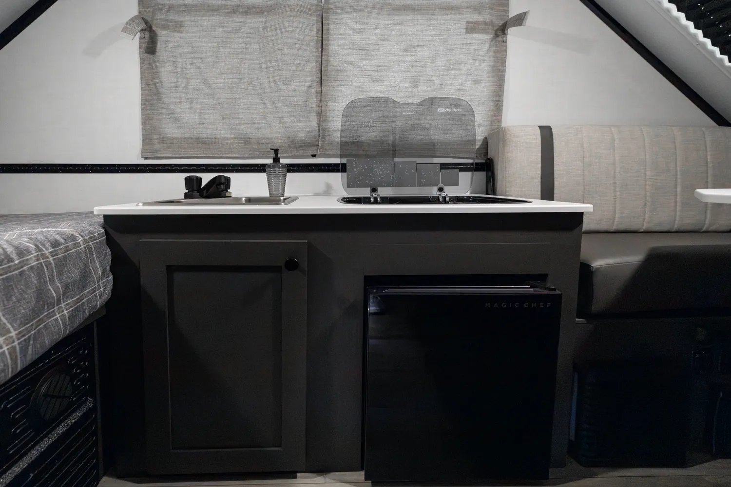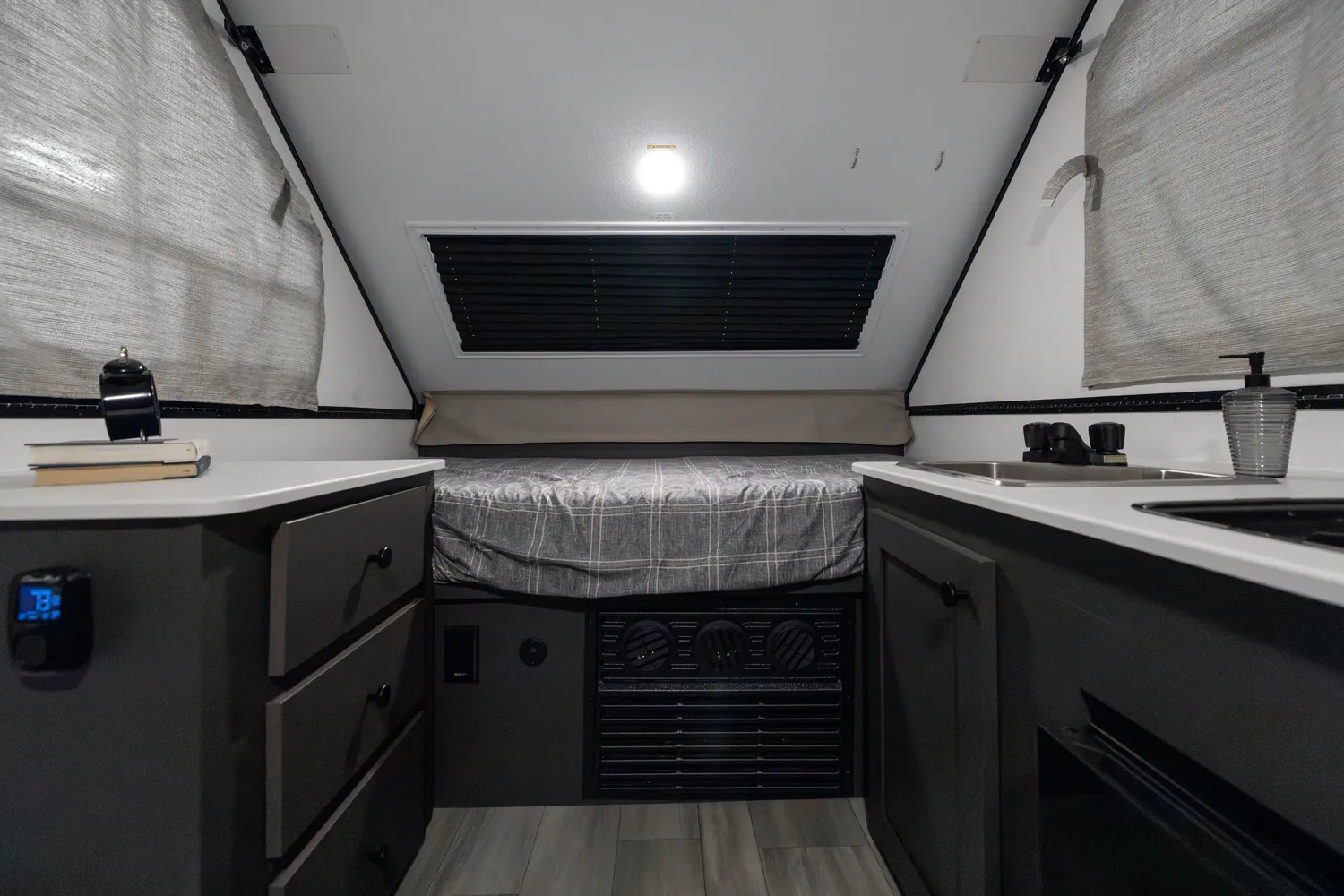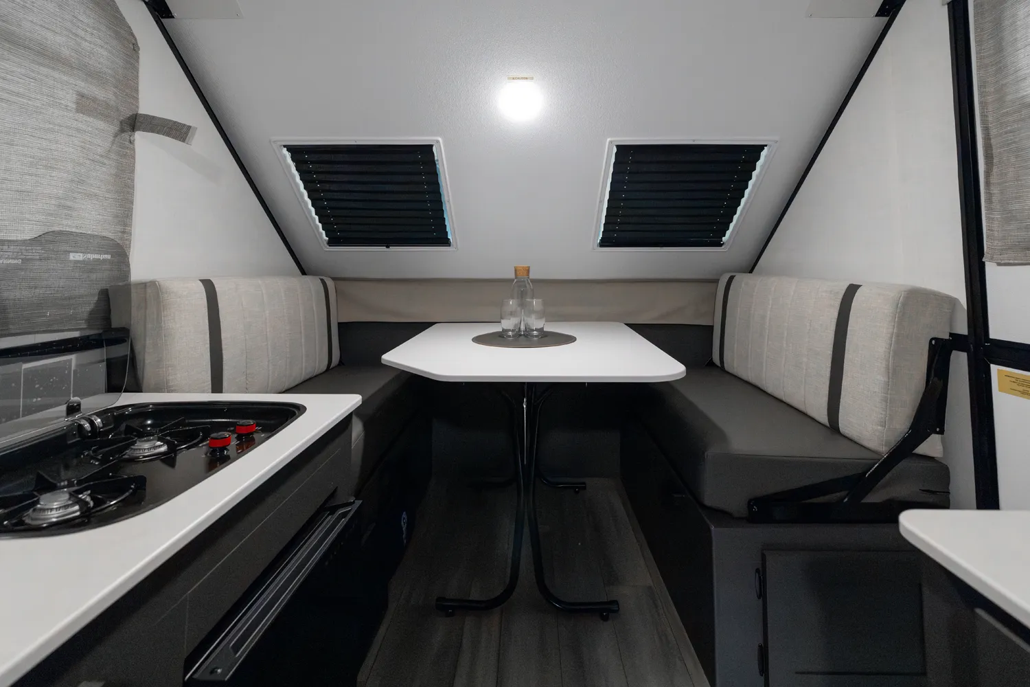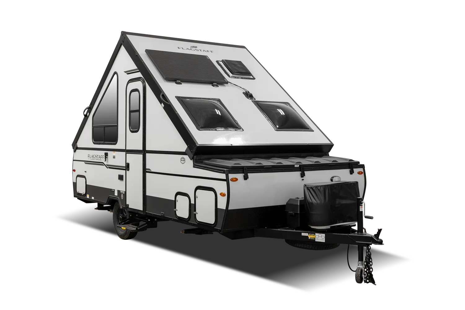 The Flagstaff T12ST is a classic A-frame built for simple, efficient camping. Inside, a front dinette offers comfortable seating and converts for added sleeping space, while a cooktop and sink provide convenient meal prep. In the rear, a flip-up 54" x 80" bed creates a spacious sleeping area. Outside, an easy-reach front storage trunk gives you plenty of room for gear and cargo.