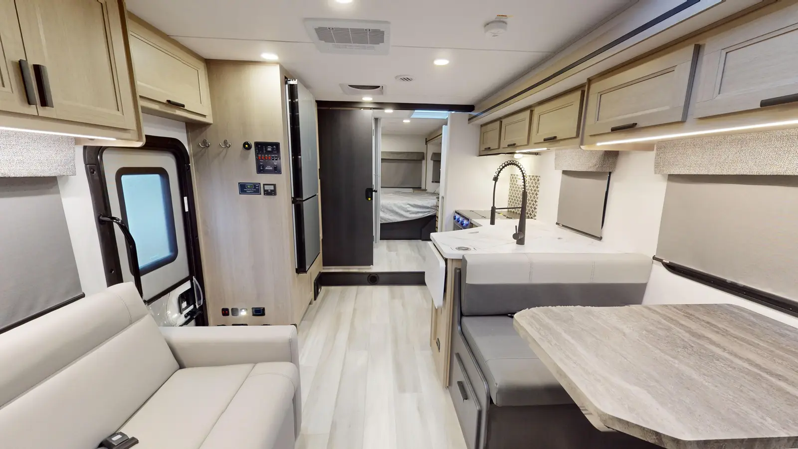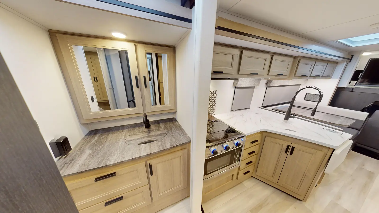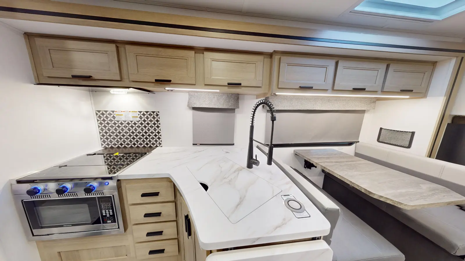 The 3051S features a full-wall slideout. The kitchen includes a booth dinette, angled kitchen sink with countertop extension, a 3-burner cooktop, convection microwave, 10 cu ft 12V stainless steel refrigerator, and pantry. Overhead cabinets provide loads of storage. The rear bedroom features a 60" x 80" walk-around queen bed, wardrobes, nightstand, linen cabinet, and 12V TV. The bathroom provides a 24 x 36 shower with glass doors and a sink vanity. Optional low-profile front cap available.