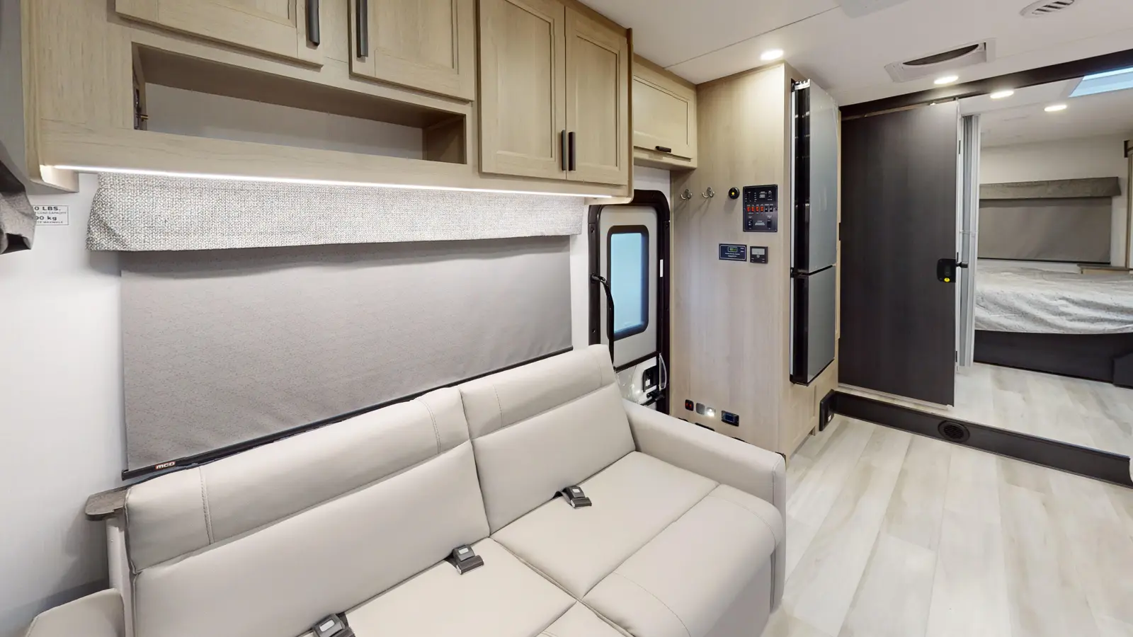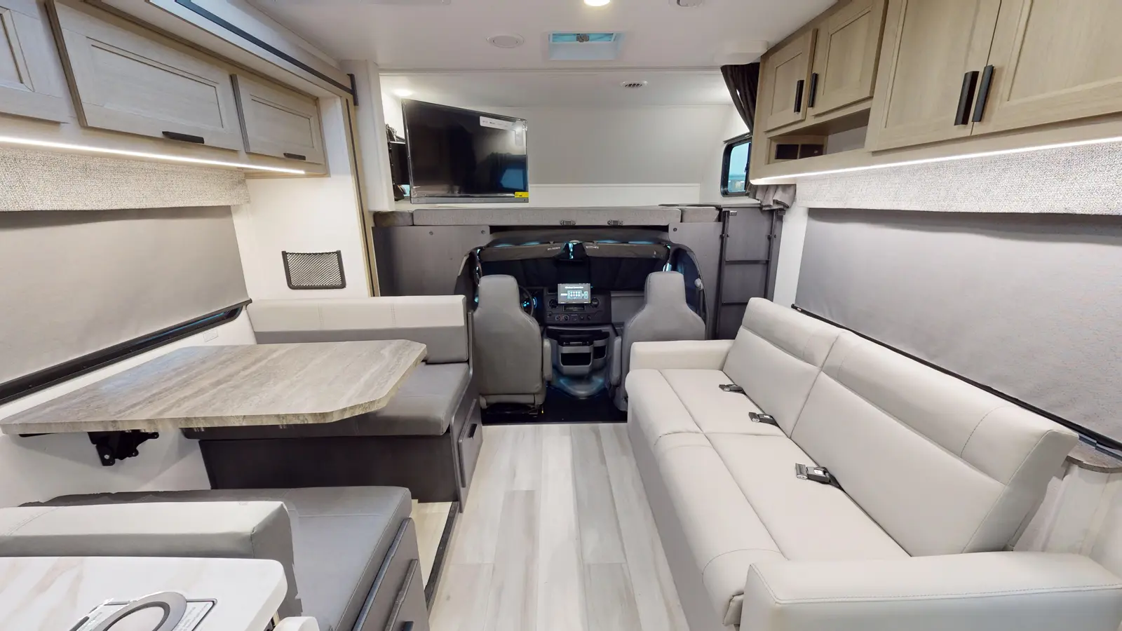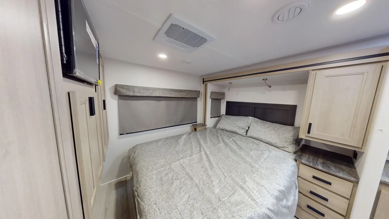 The 3051S features a full-wall slideout. The kitchen includes a booth dinette, angled kitchen sink with countertop extension, a 3-burner cooktop, convection microwave, 10 cu ft 12V stainless steel refrigerator, and pantry. Overhead cabinets provide loads of storage. The rear bedroom features a 60" x 80" walk-around queen bed, wardrobes, nightstand, linen cabinet, and 12V TV. The bathroom provides a 24 x 36 shower with glass doors and a sink vanity. Optional low-profile front cap available.