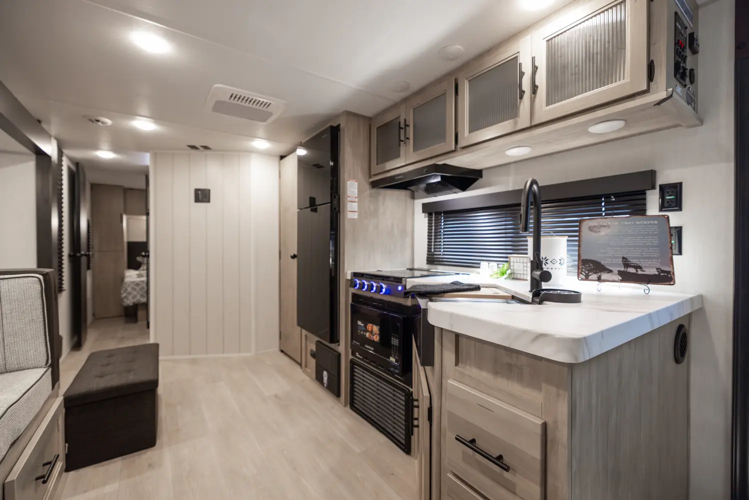 • Cherokee Black Label Grey Wolf (Deep Tinted Frameless Automotive Glass Windows, High Gloss Gel Coat Exterior Sidewalls, Multicolor Reading Lights, Pillowtop Mattress Upgrade, Power Tongue Jack, Pull Out Sprayer Faucet, Solid Surface Countertops, Thermo Foil Arctic Insulation)