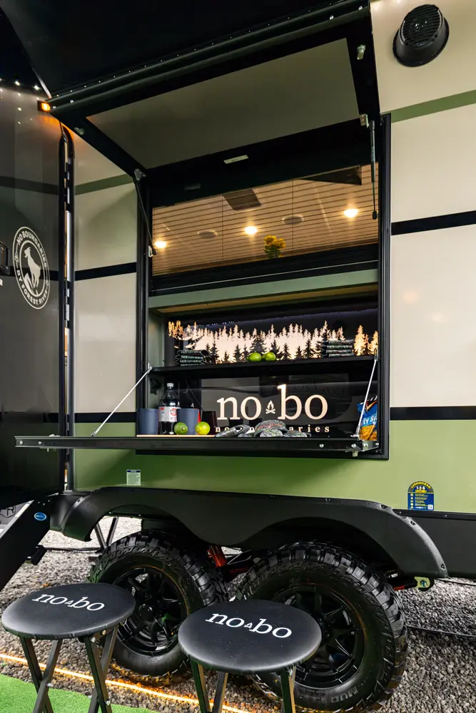 The NB19.0 is a feature-packed travel trailer built for comfort and adventure. Its rear kitchen offers ample counter space and storage, while a walk-through bath connects to a private front bedroom with a queen bed and wardrobes. Outside, the Trailgate Outdoor Bar adds space for outdoor entertaining and meal prep. With a roomy slide-out and lightweight, all-season build, the NB19.0 delivers big comfort in a perfectly towable package.