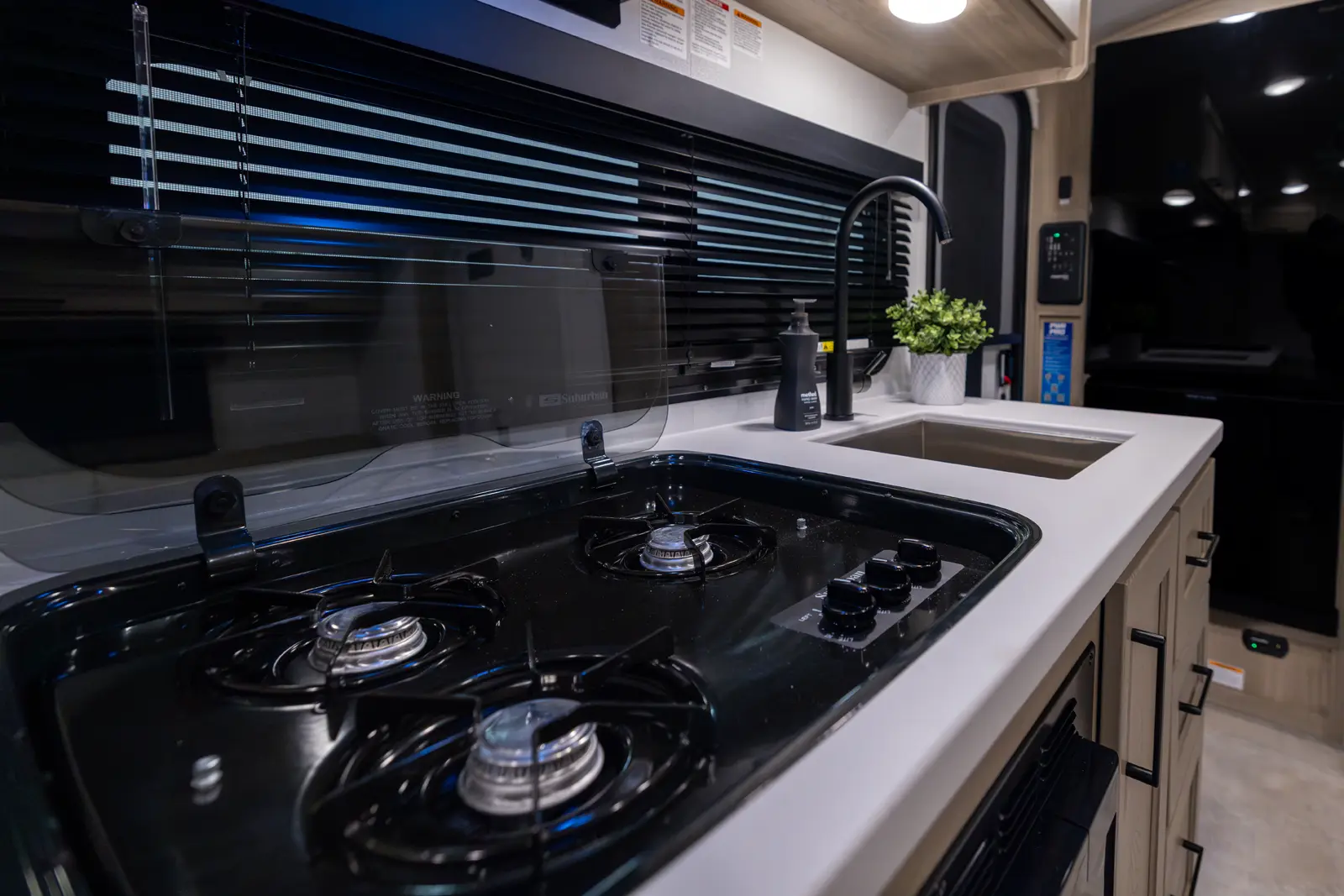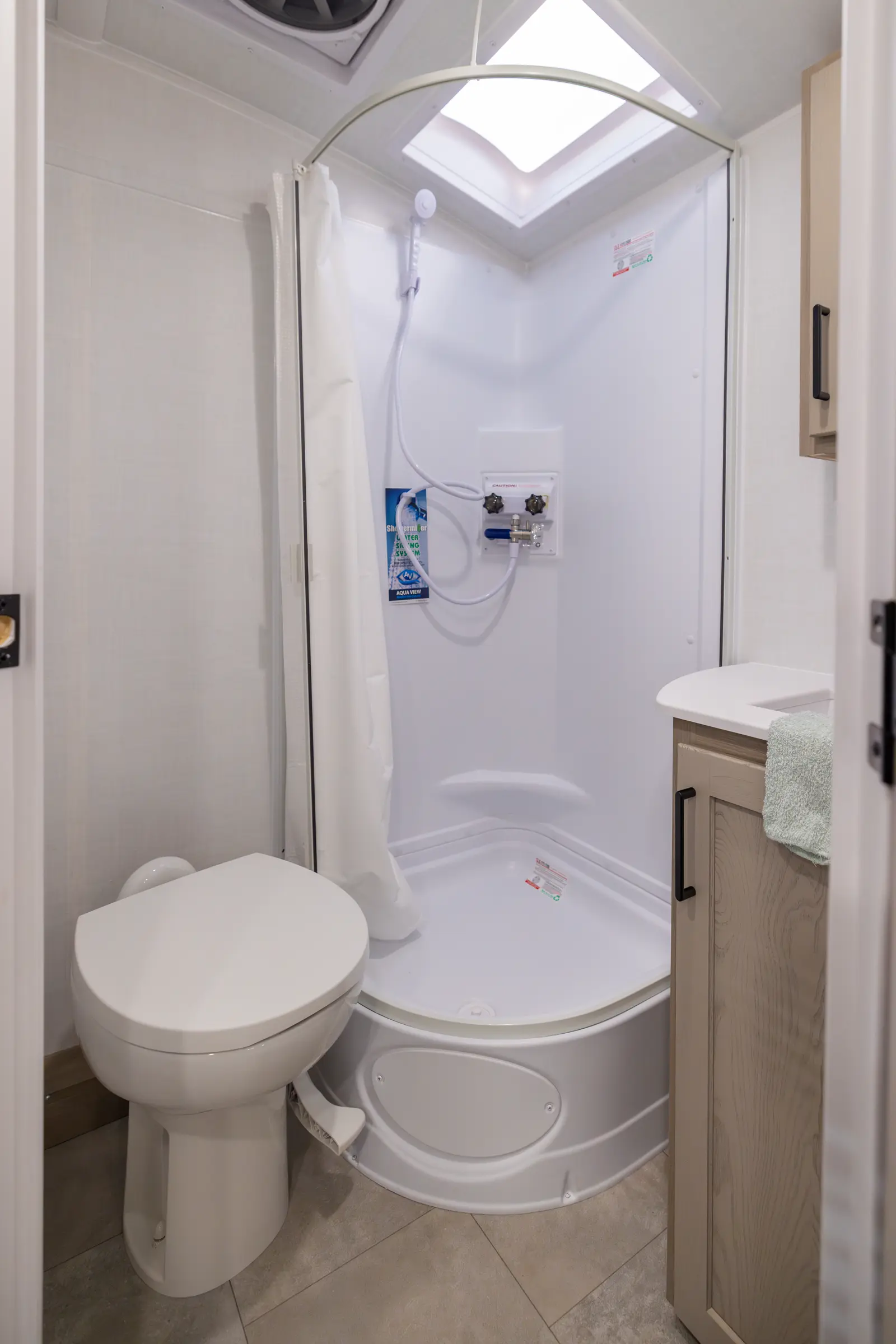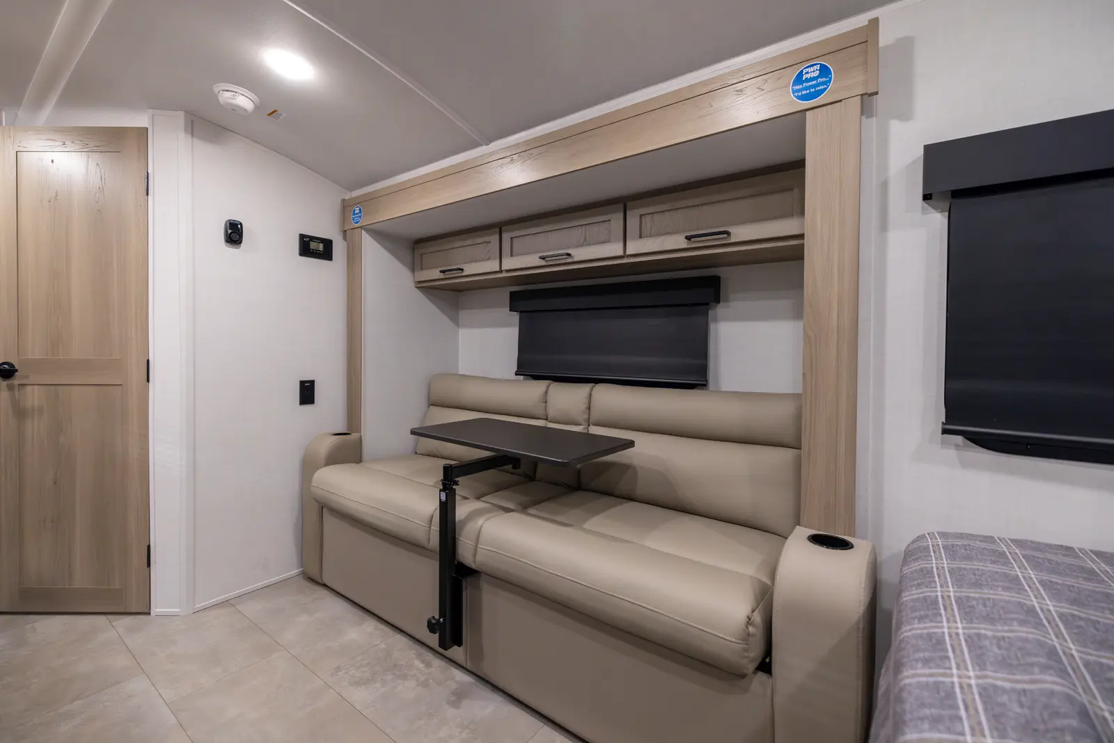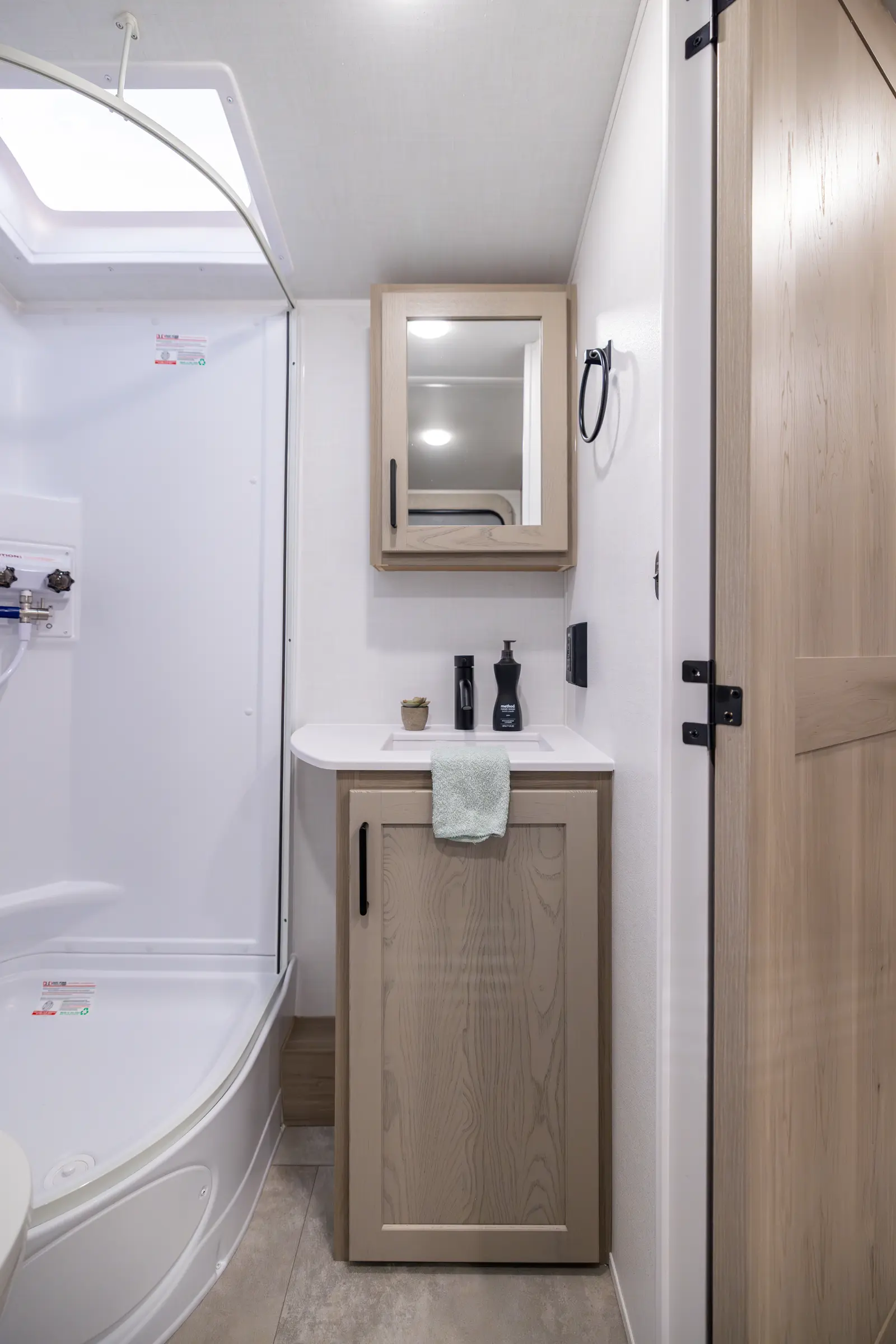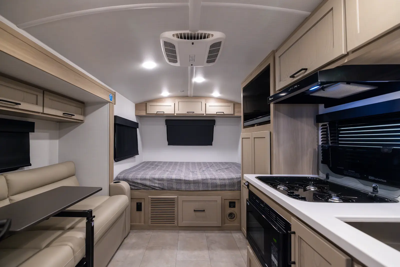 The Rockwood Geo Pro G19FBS is a rear entry couples coach with a small slide that offers so much great space. The large bathroom is one of the best features of this small couples coach. The 72” pull-out sofa also makes for a great bed for guests, children or pets. At 20’ and light weight, you will not be able to get more walk around footage than this great couples coach.