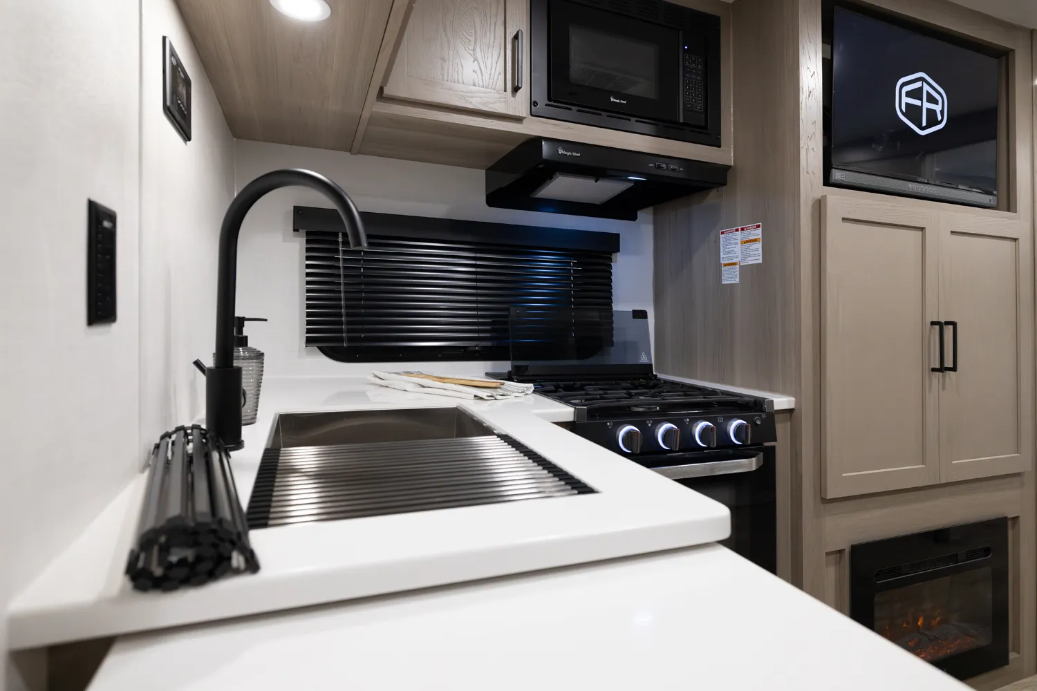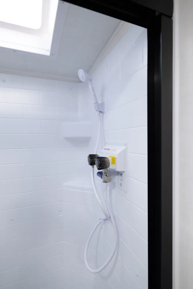 This unit is unique with its big 36" sliding doors leading to the bathroom and bedroom. These doors make moving around for a broad-shouldered person easier and comfortable. The entertainment center is loaded with 32" tv, a residential-style soundbar and a fireplace space heater. Across from this lovely entertainment center is a 72" theatre seating which is perfect for reclining and watching a good movie.