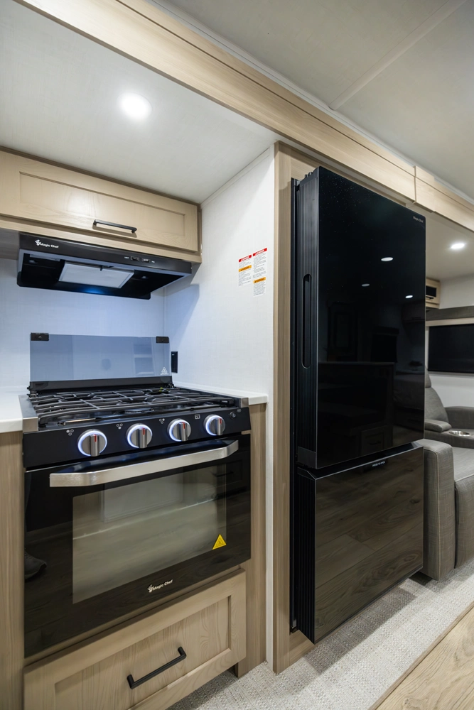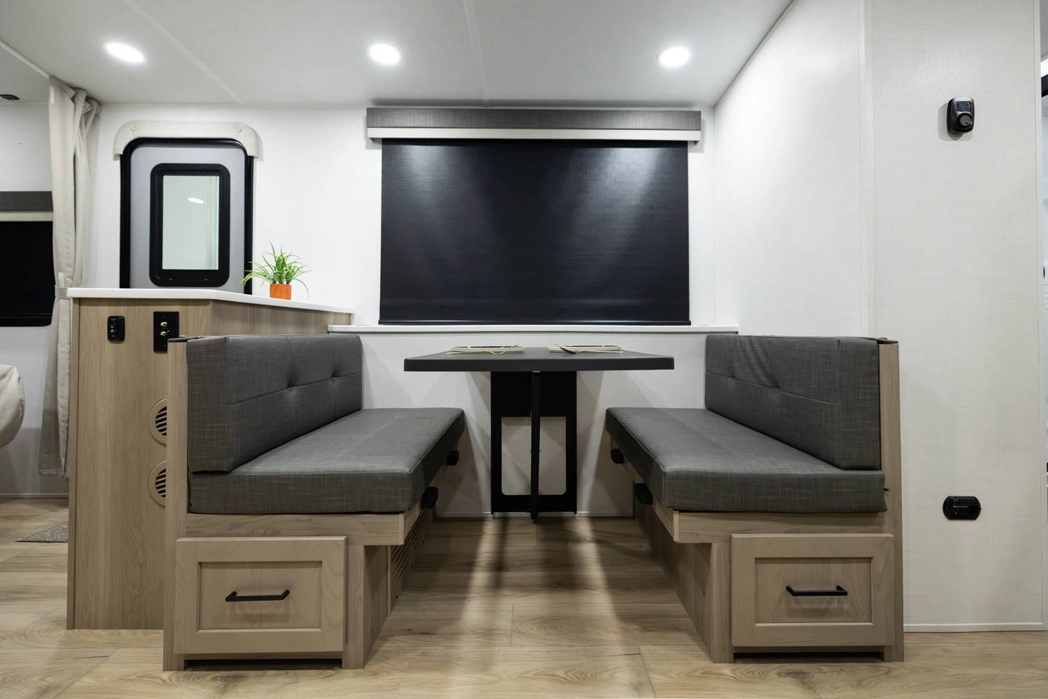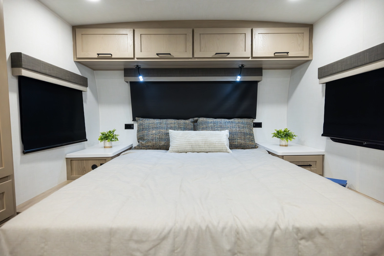 The 2522FB is a beautiful front bedroom floor plan featuring a unique wardrobe/pantry slideout for exceptional storage and organization. The living area includes theater seating directly across from the adjustable “televator” which raises for TV viewing and lowers so you can enjoy the massive door side window views. A versatile dinette and spacious rear kitchen with plenty of counter space completes the thoughtful design.