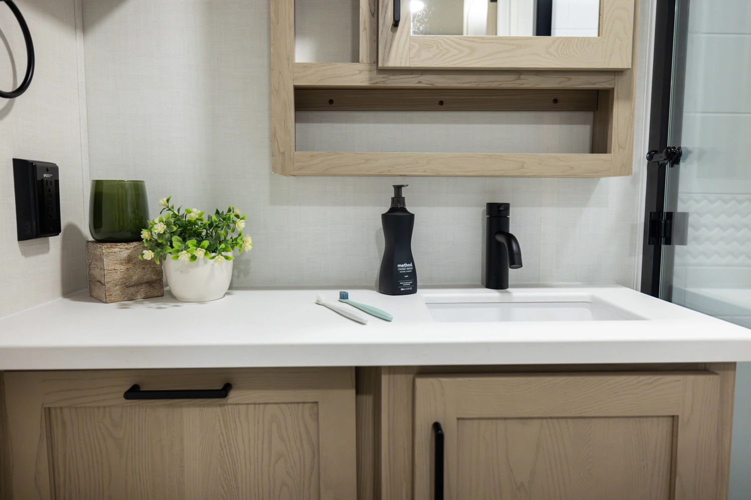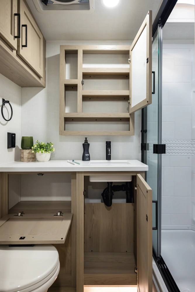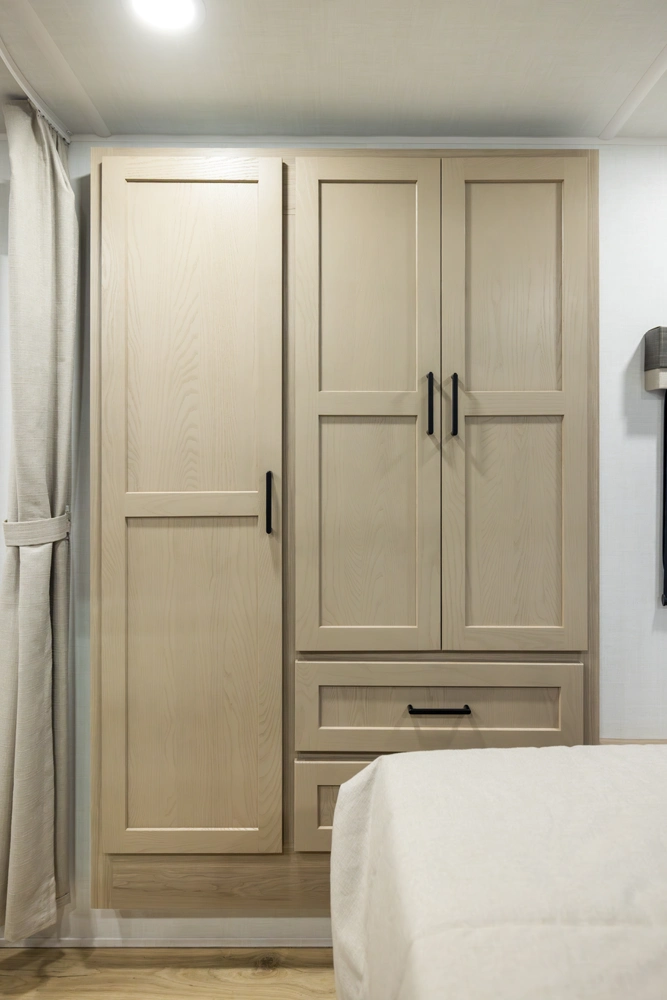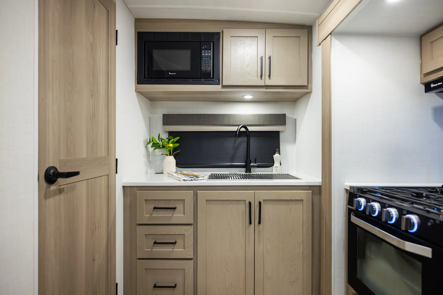 The 2522FB is a beautiful front bedroom floor plan featuring a unique wardrobe/pantry slideout for exceptional storage and organization. The living area includes theater seating directly across from the adjustable “televator” which raises for TV viewing and lowers so you can enjoy the massive door side window views. A versatile dinette and spacious rear kitchen with plenty of counter space completes the thoughtful design.