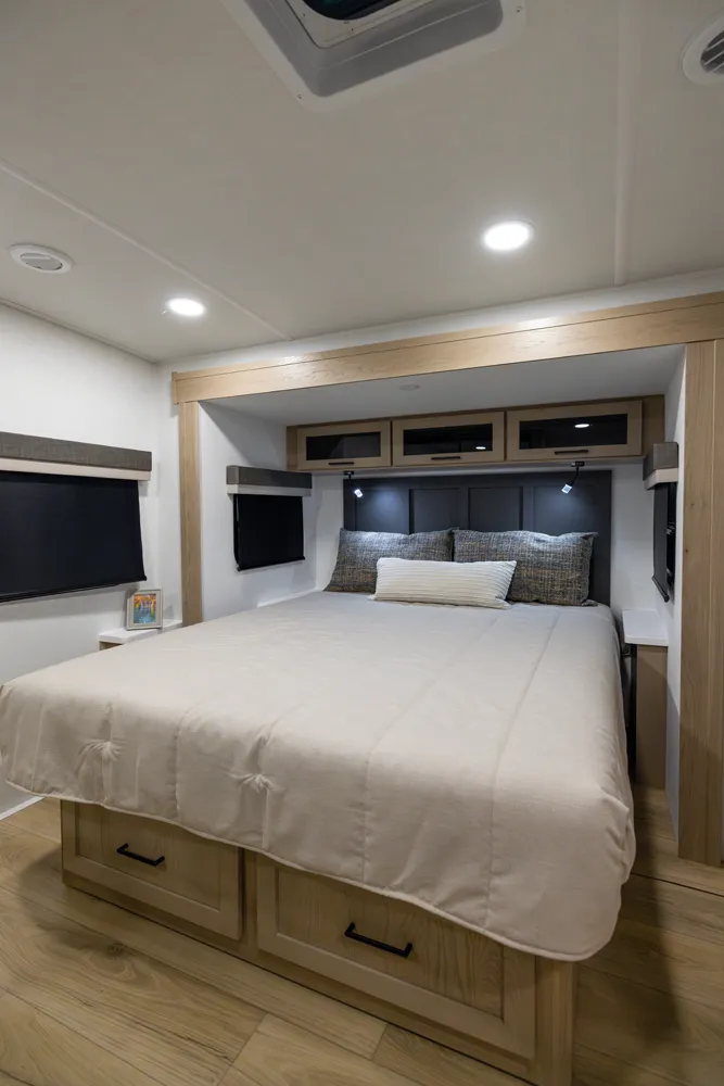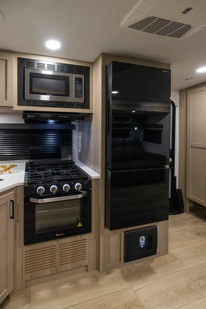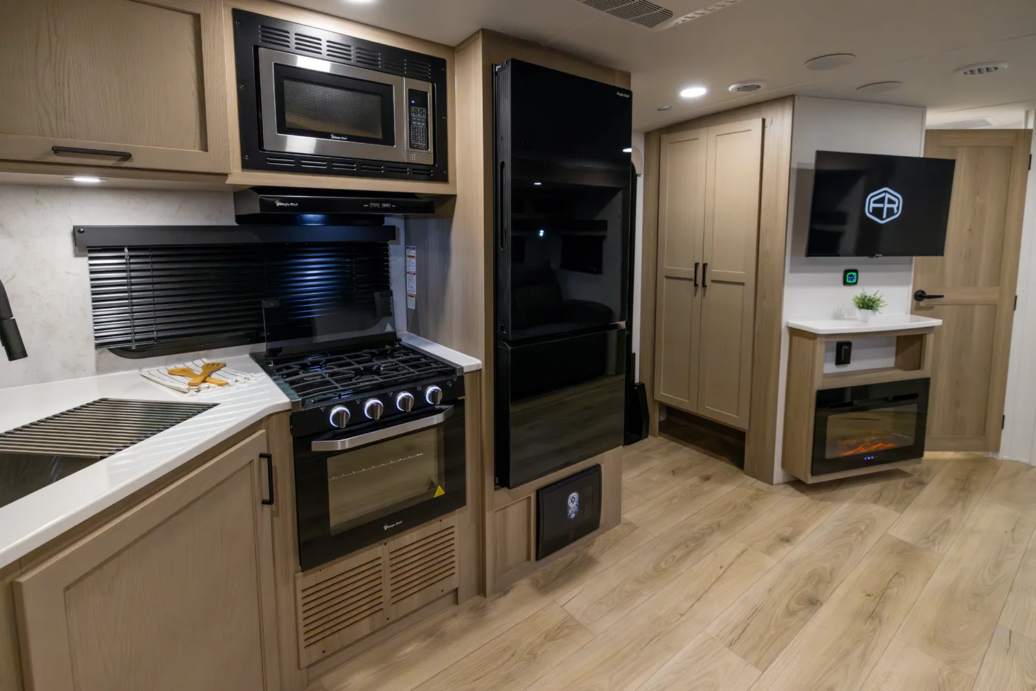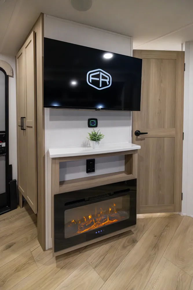 Holy counter space! This front kitchen offers a ton of counter space with a giant window to enhance the camping experience. The 67" theater seating is conveniently located right in front of the entertainment center and the cozy space heating fireplace. The master bedroom offers a big 60"x 80" queen bed slide out which makes the room feel residential. This bedroom has a separate entry and exit door that is also covered by the giant 21' awning.