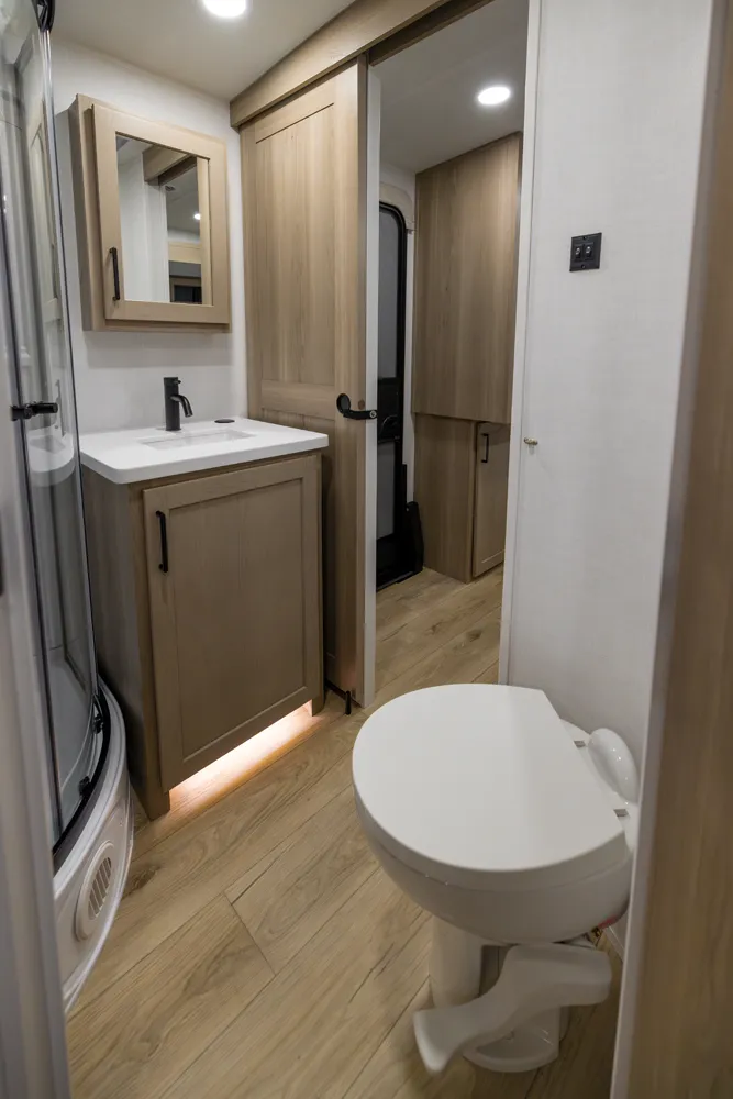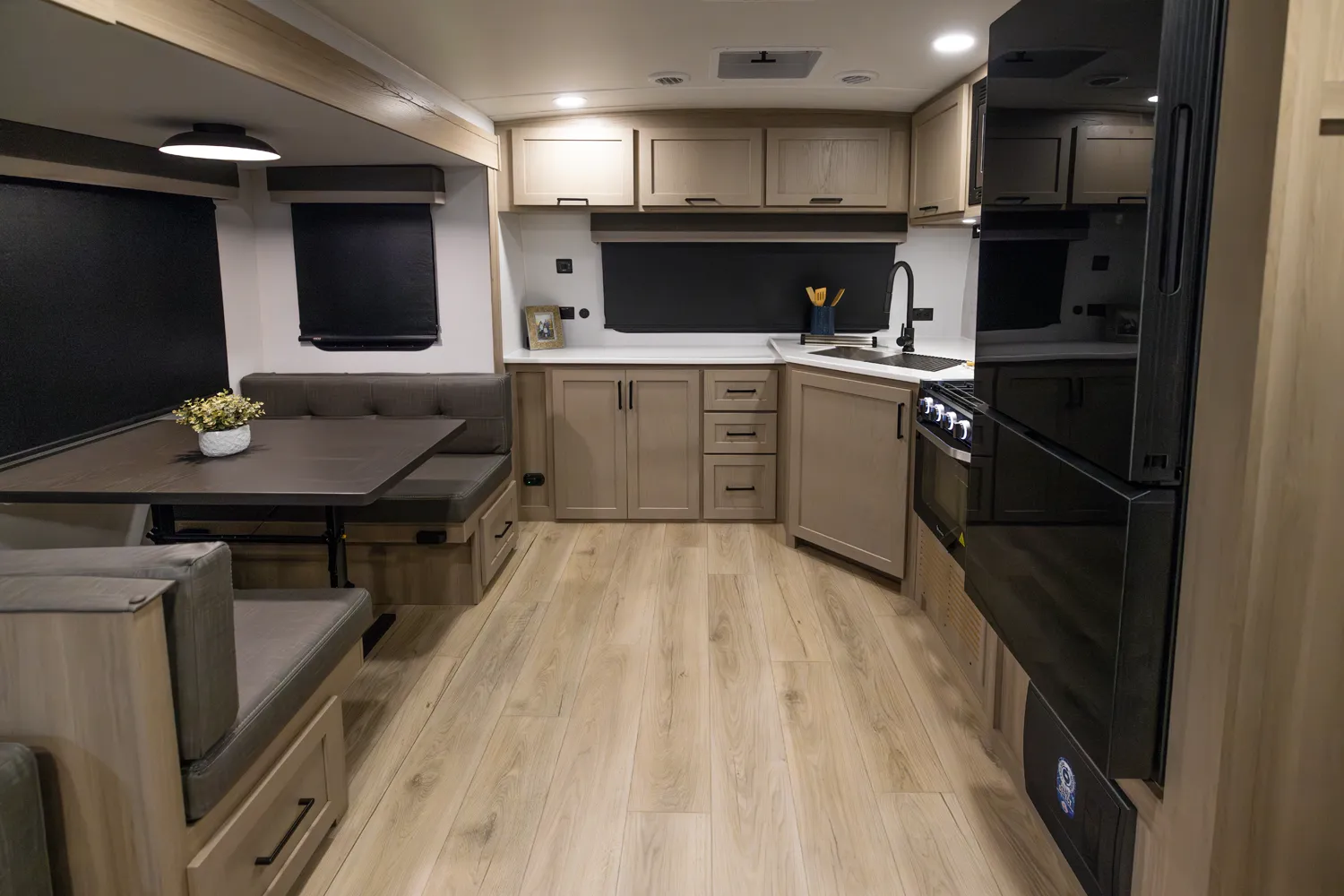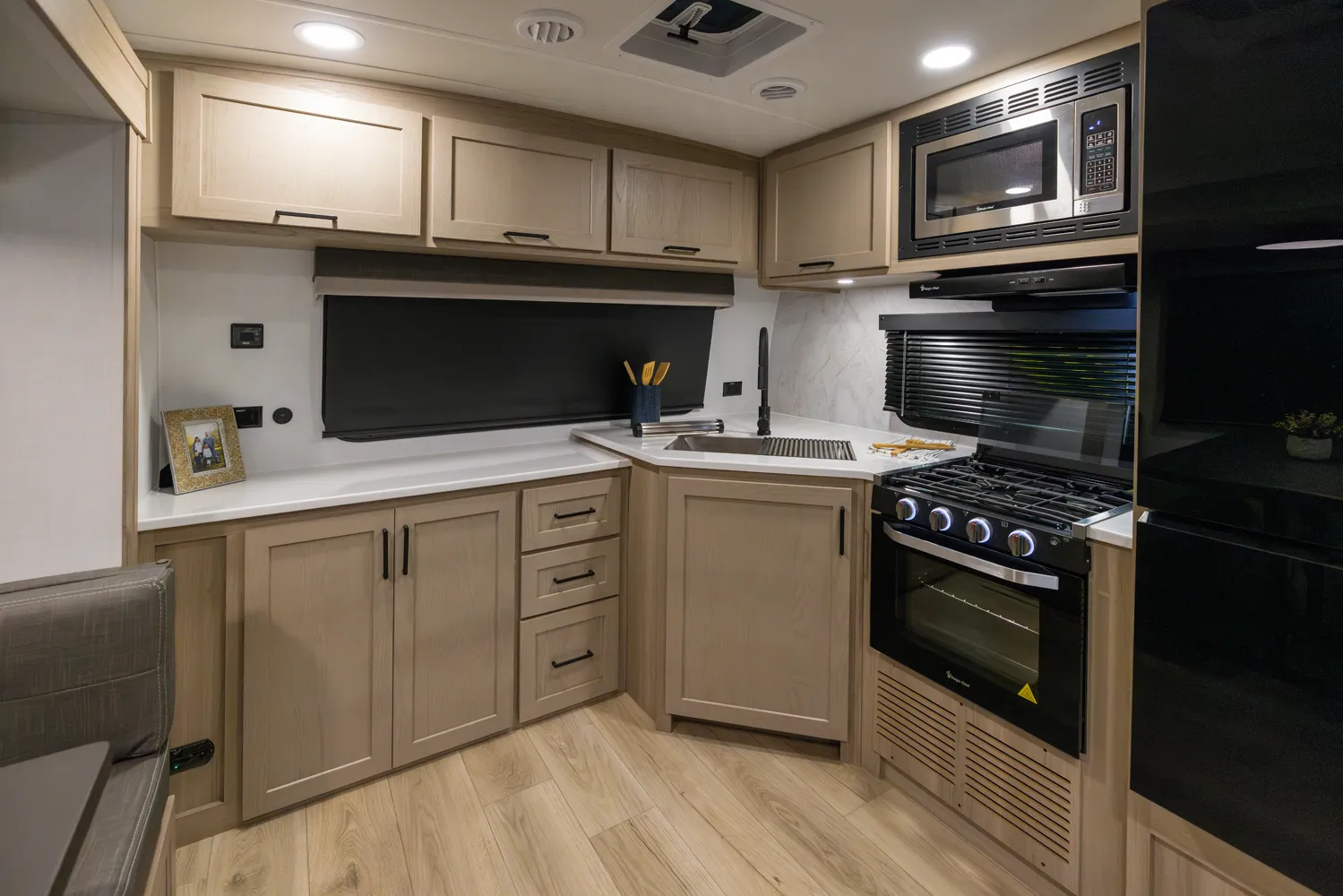 • Platinum Package: Auto Leveling, Frameless Windows, 1800W Inverter, MORryde Strut Assist Entry Step, Dual 30 LP Tanks