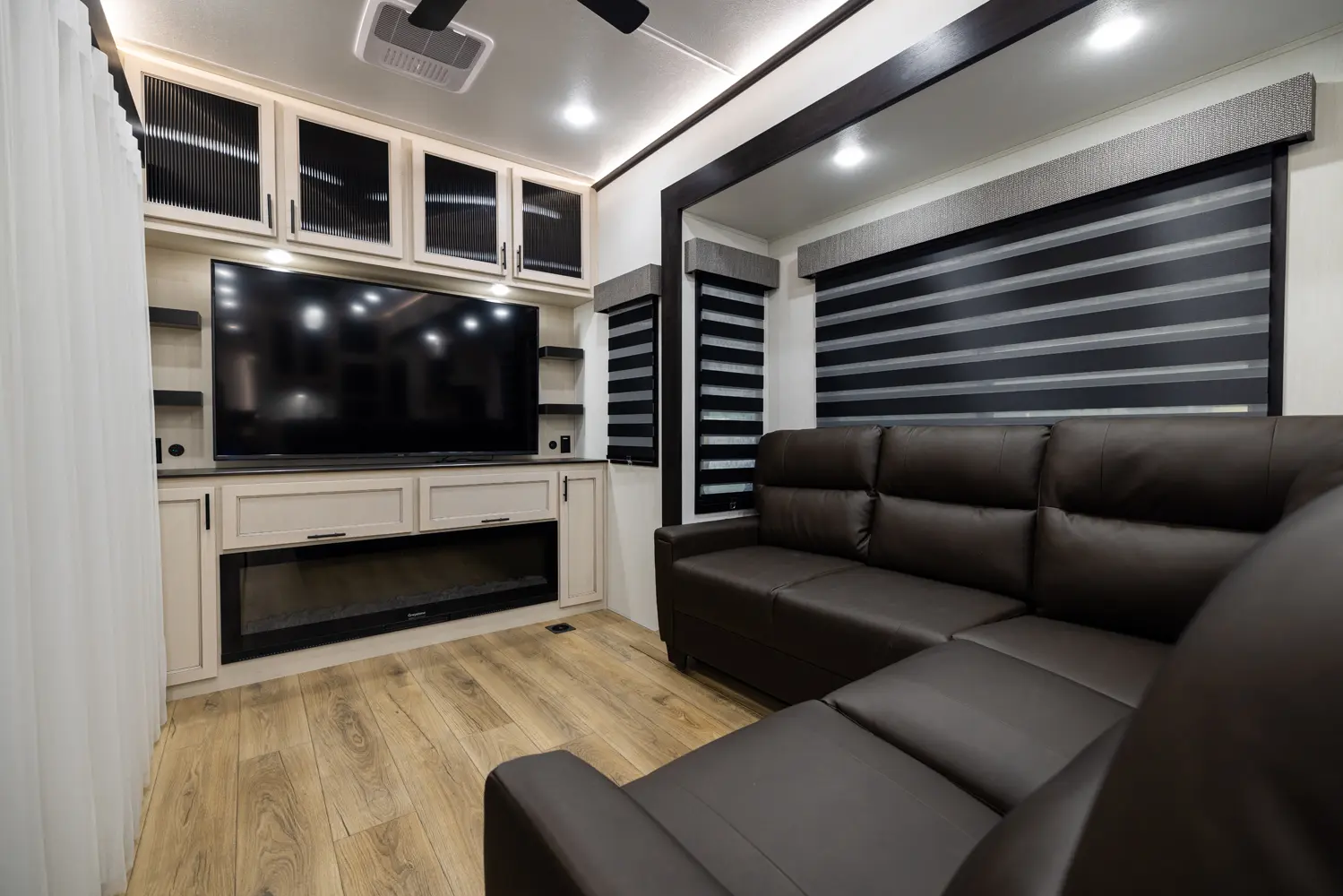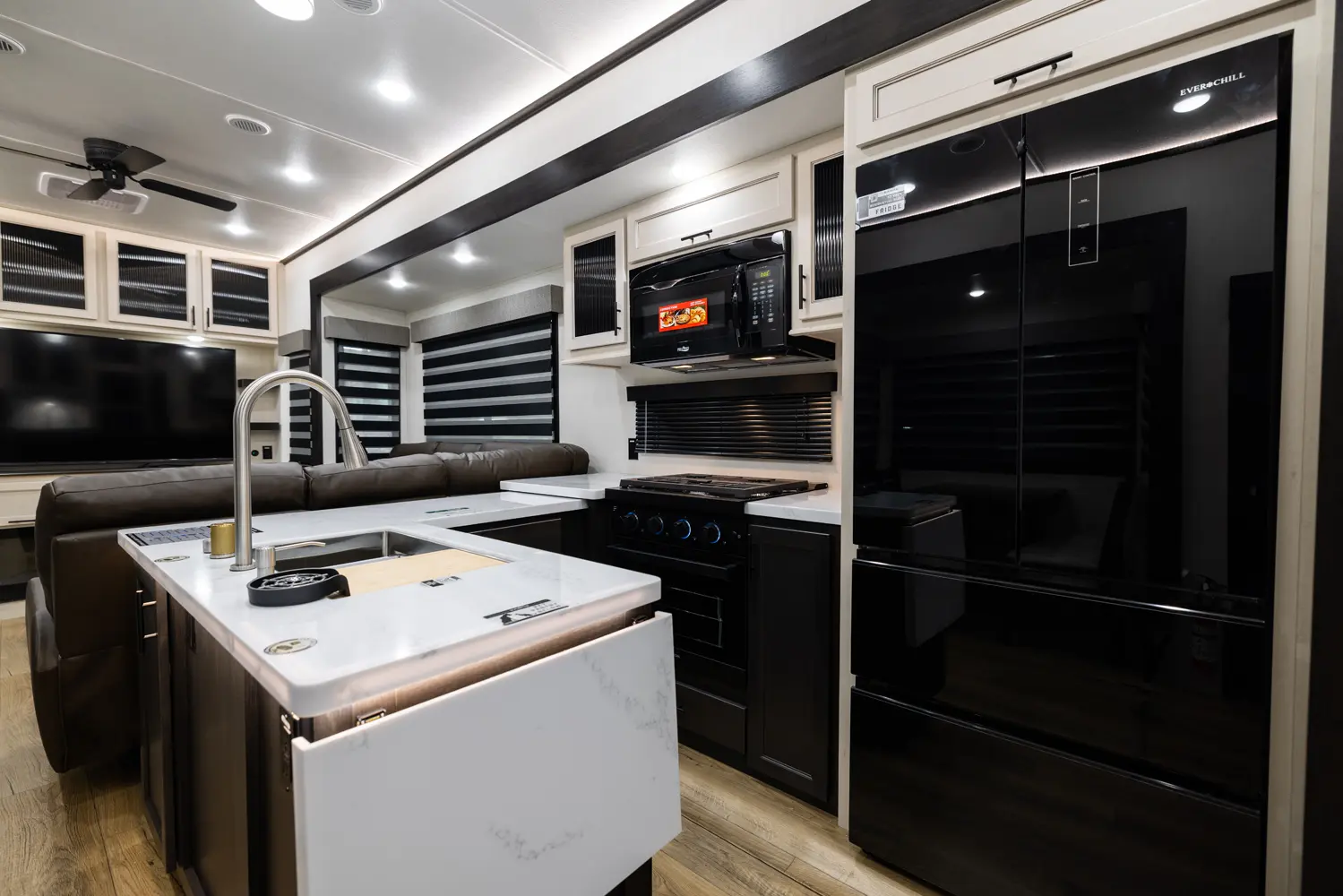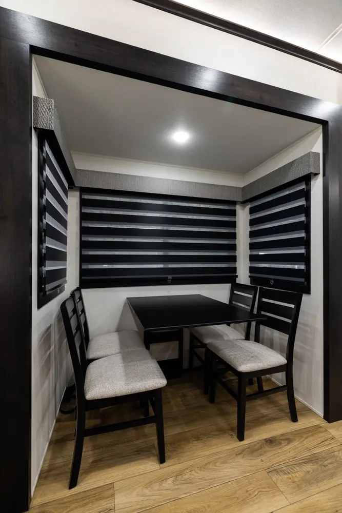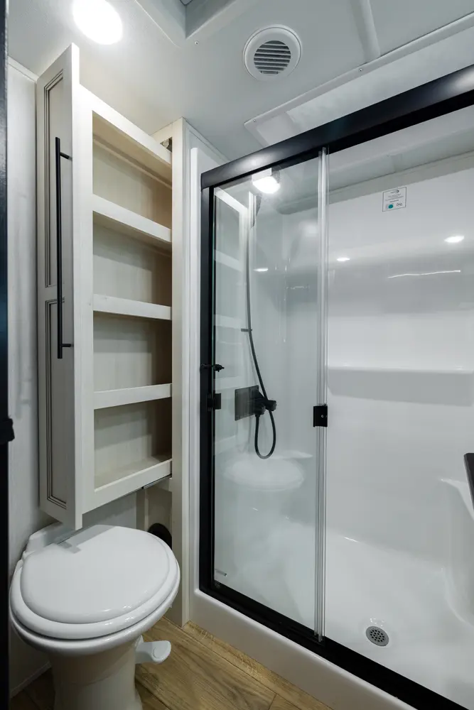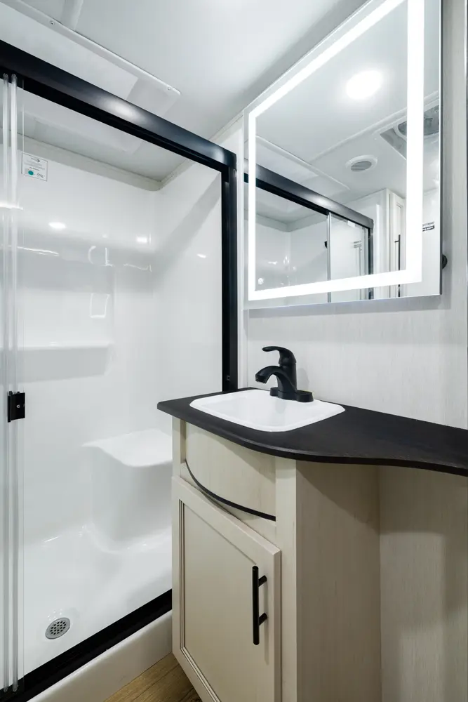 Discover the future of 5th wheel RV living with the Sabre Sundeck 33RLP by Forest River. This innovative RV features an industry-first retractable patio deck, extending your outdoor living space. Inside, you’ll find a L-shaped sectional, perfect for relaxation, and an impressive entertainment center complete with a fireplace. The fully equipped kitchen is a chef’s dream, boasting ample solid surface countertops, a residential-style oven, an air fryer microwave, and a 12-volt refrigerator.