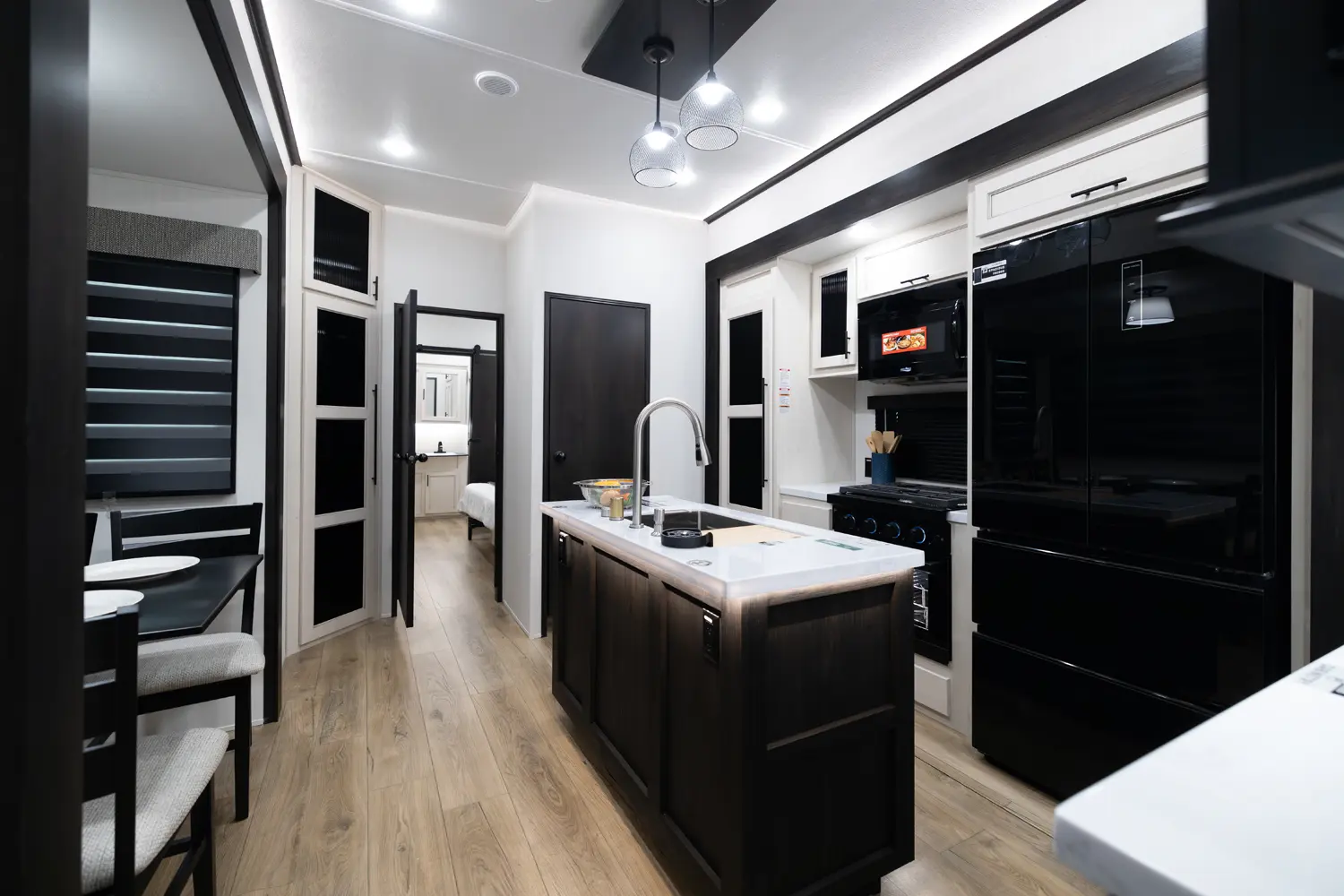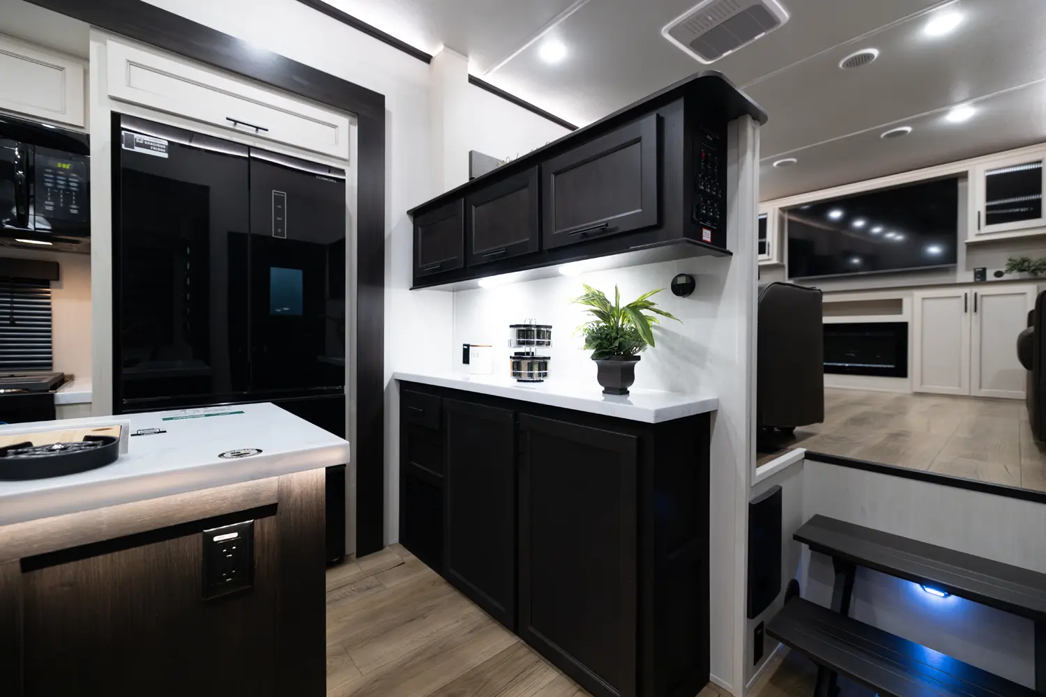 Discover the Forest River Sabre 37FLH, a luxurious 5th wheel RV designed for entertaining! This stunning front living room layout is perfect for movie nights or extra sleeping space, featuring two tri-fold sleeper sofas. The private owner’s suite includes a spa-like full bathroom, while a convenient half-bath adds extra functionality. The chef-inspired kitchen boasts premium solid surface countertops, a 12-volt fridge, air fryer microwave, large oven, and handcrafted real wood cabinetry.