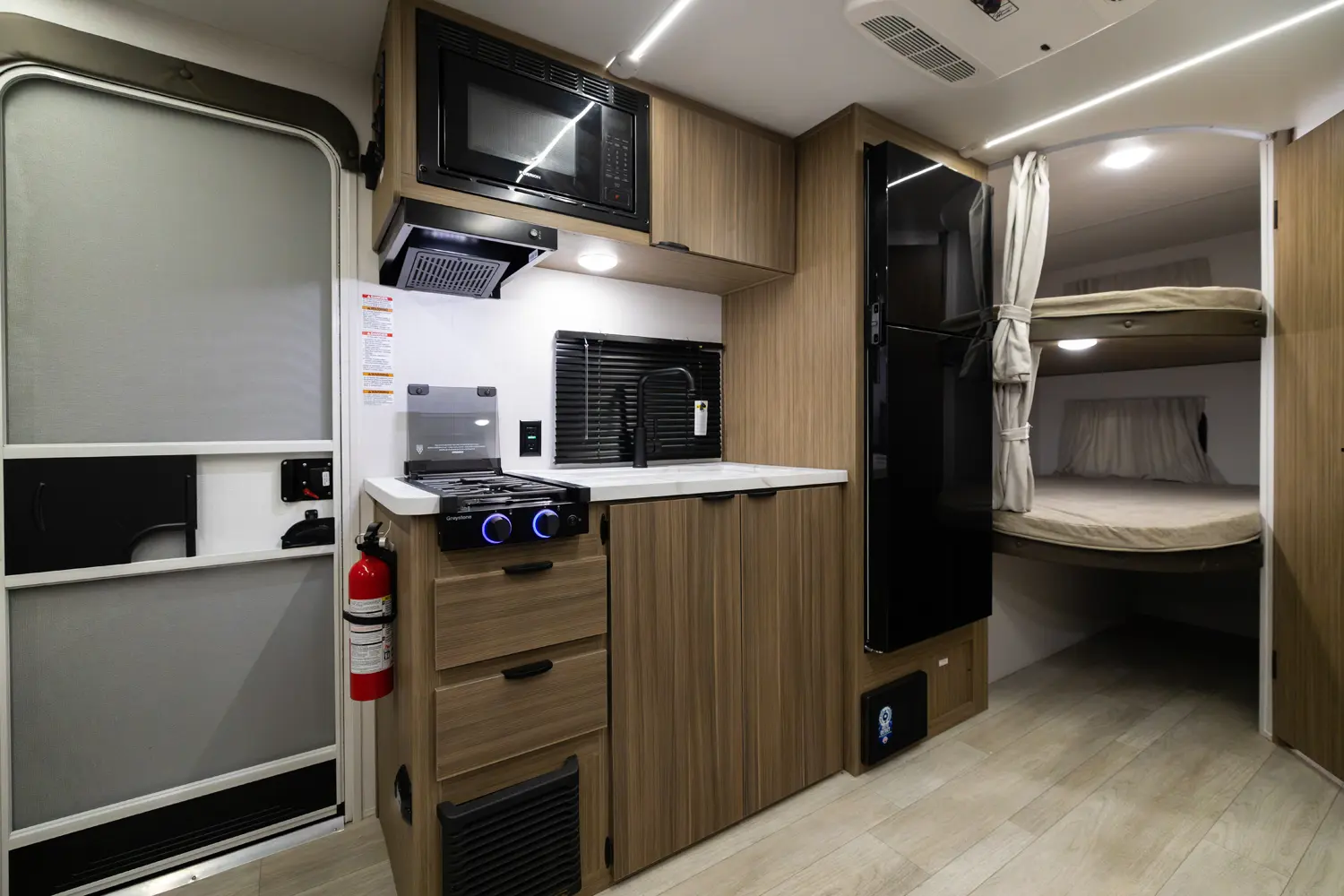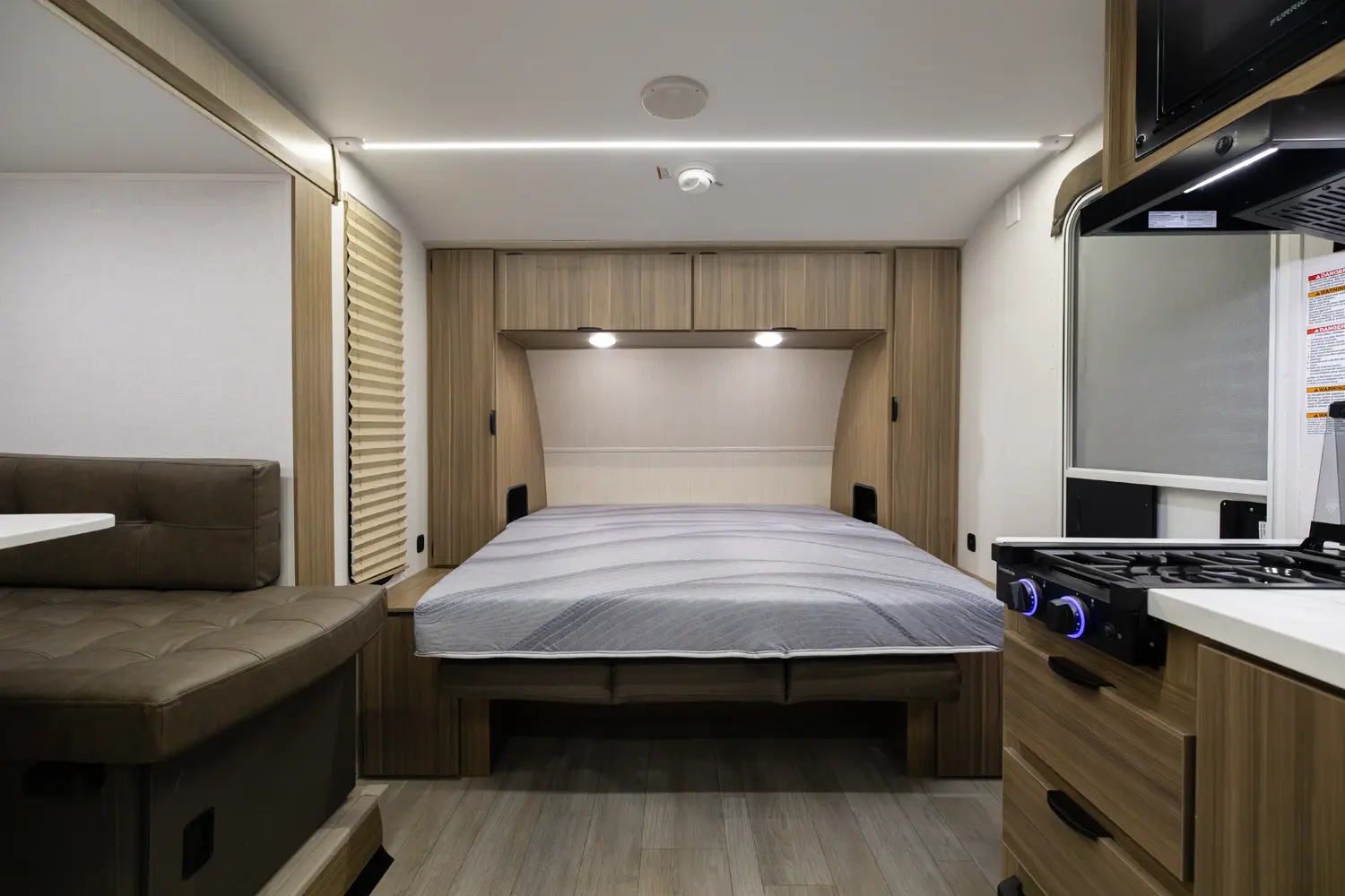 The 17BHSK is packed with features and weighs in at less than 4,000 lb. The unique front queen bed flips up to create additional seating space during the day. The kitchen slide provides extra room for the ever-popular U-dinette and includes a panoramic window. The rear bunkhouse gives you double over double bunks for additional flexibility and comfort, while the outside kitchen gives you additional options for mealtime and entertaining.