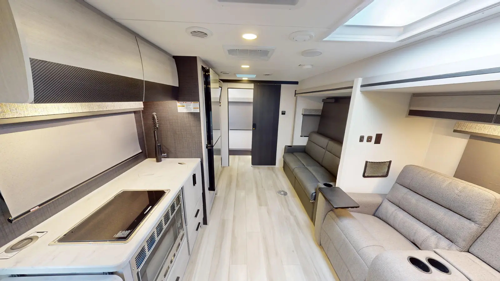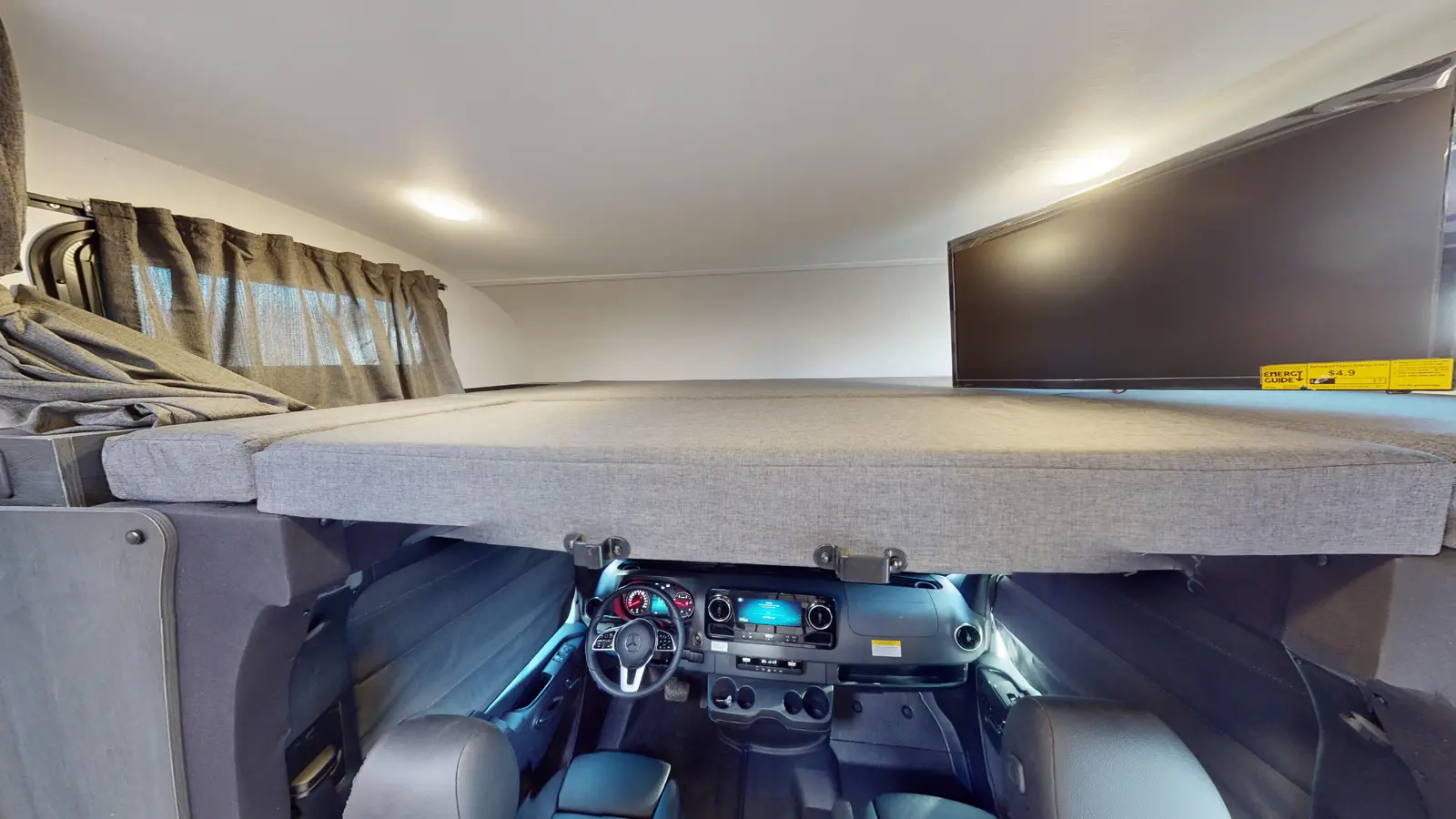 The Solera 24SRB is built on the Mercedes-Benz Sprinter 3500 chassis. It features a unique Murphy Bed in the central living area to maximize available space, in a slideout that provides even more elbow room. The kitchen area is fully equipped for meals on the go, with a 10.7 cu ft 12V refrigerator, recessed 2-burner range with flush glass cover, and a 1.3 cu ft convection microwave oven. Overhead cabinets and a dedicated closet, plus hidden drawers behind the TV, provide ample storage. The bathroom takes up the rear wall of the unit and includes a 24" x 36" shower, commode, sink with medicine cabinet, plus a linen closet.
