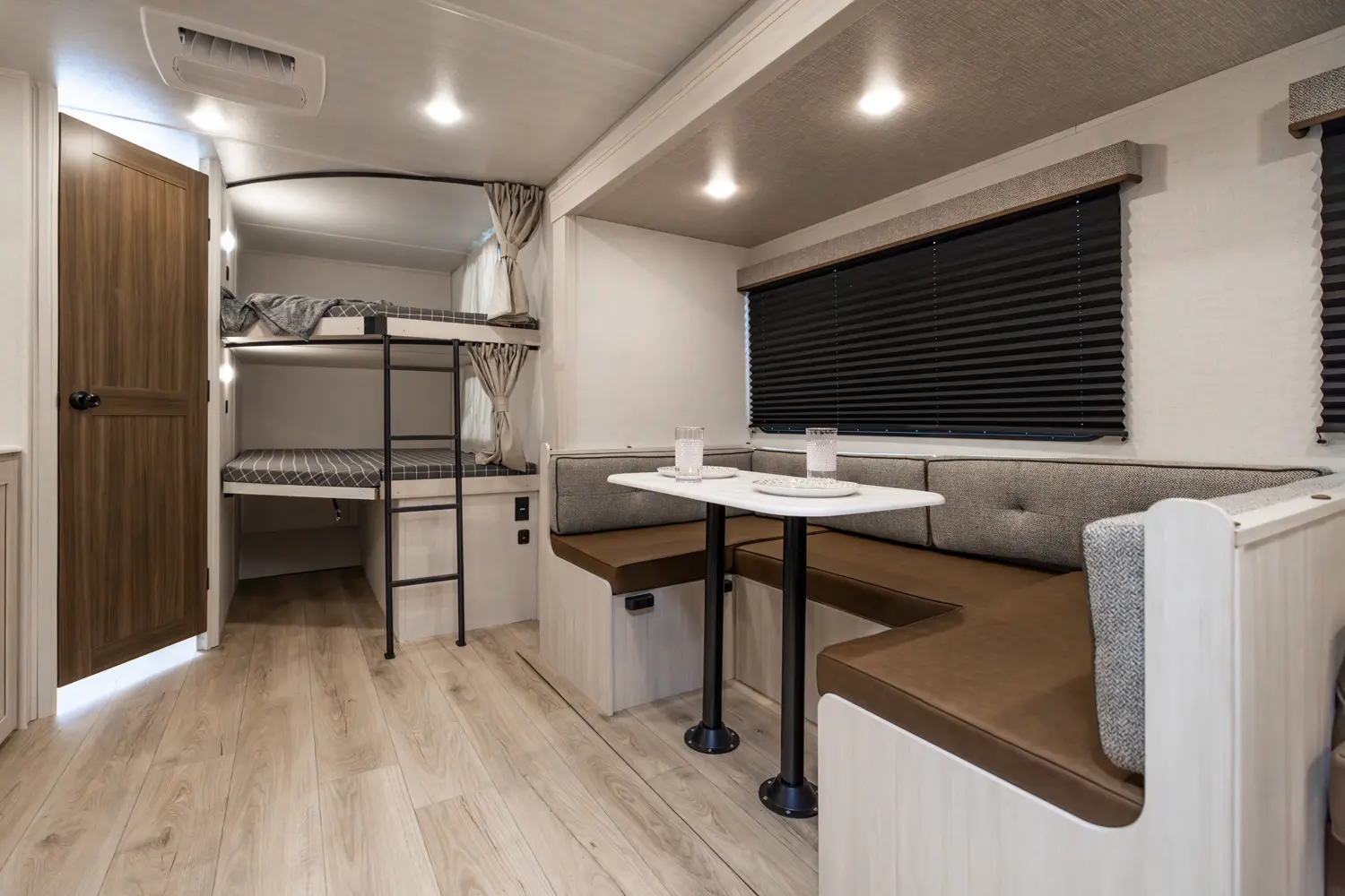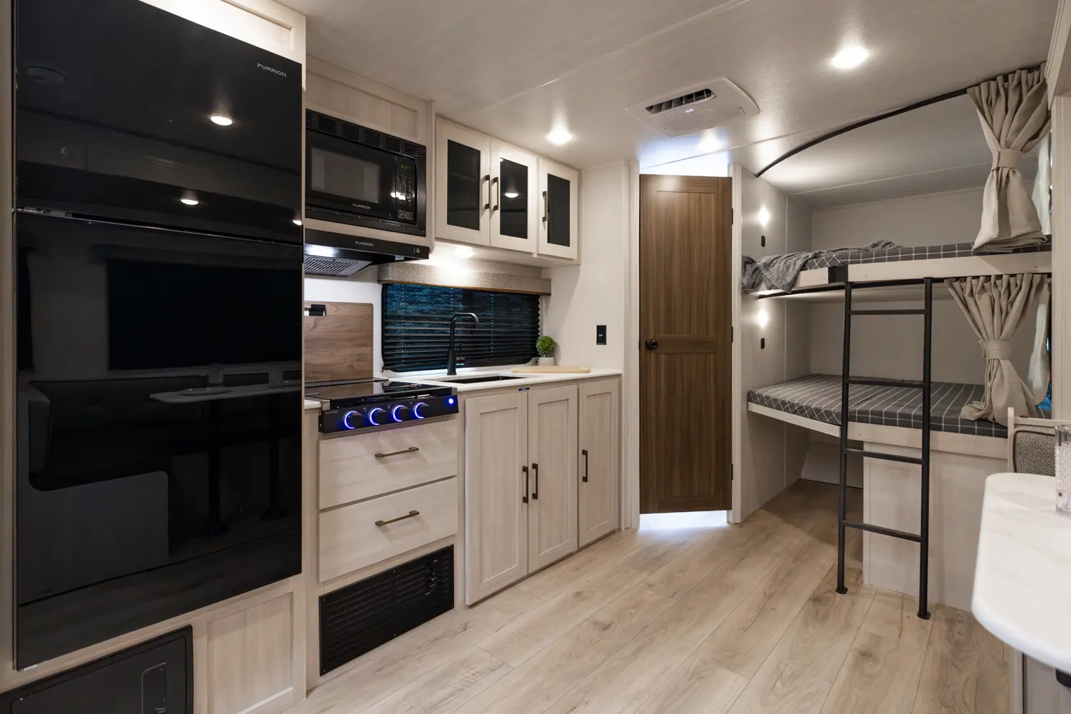 This 33' 4" travel trailer features a front queen bed, a convertible U-shaped dinette, and a rear corner bunkhouse with a ladder-accessible top bunk. The kitchen includes a 10 cu. ft. 12V refrigerator, oven, and stovetop. Exterior amenities include a 19' electric awning, outdoor camp kitchen, and a hot & cold spray port.