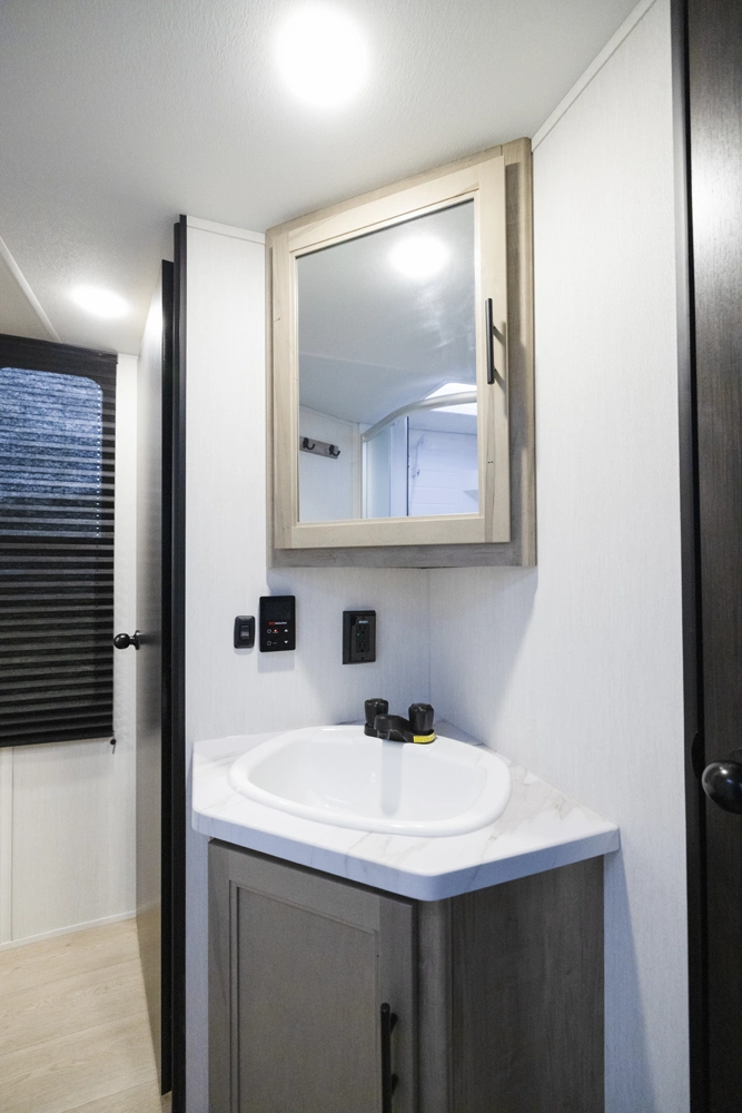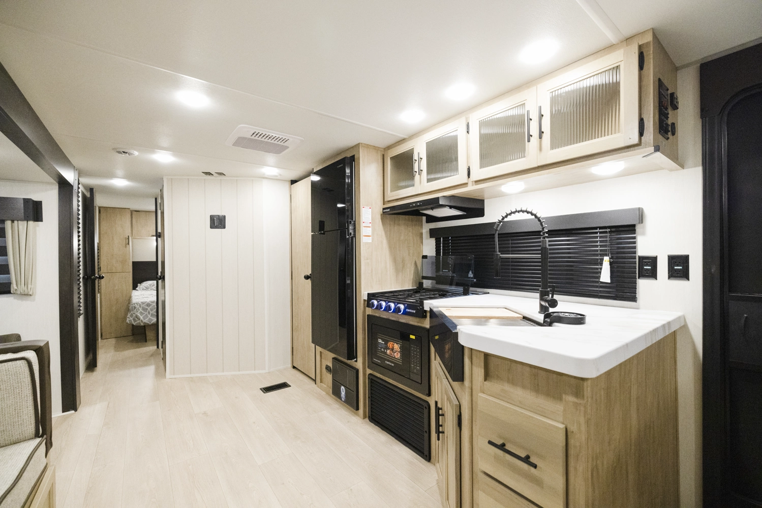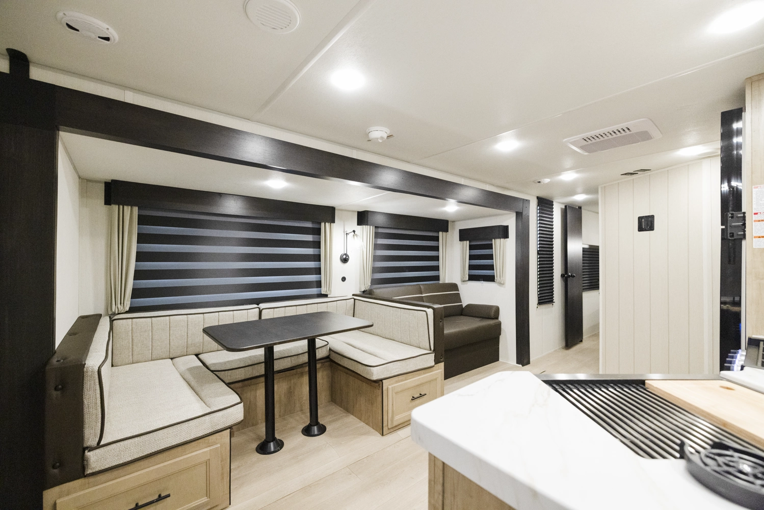 This innovative model lets the customer escape the ordinary with this 3 bedroom model. What separates the 294GEBG from the rest is the rear sleeping areas where a full queen loft bed is featured along with a private bunk area off to the side. This separation created privacy and allows for a Full Bar and Grill featuring an exclusive side-by-side refrigerator and freezer, ice maker, pull-out cooktop, sink and large storage areas.